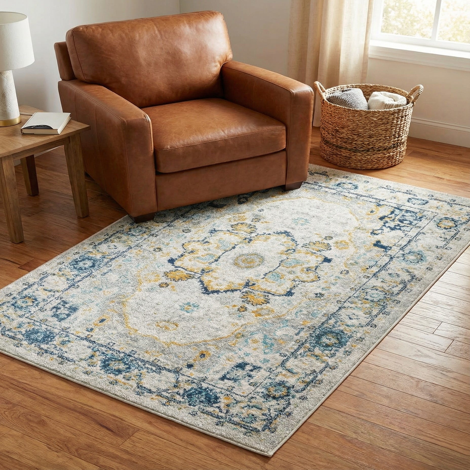 Primary color is Gray. Colors in this rug include: Gray, Ivory, Navy Blue, Yellow, Light Blue.