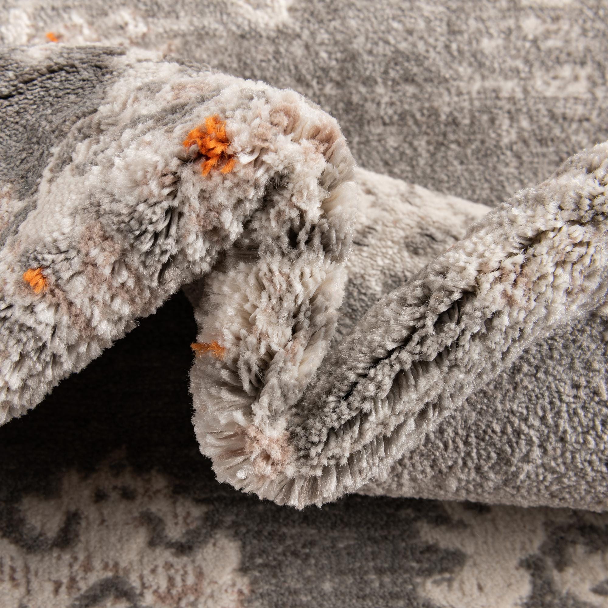 Primary color is Gray. Colors in this rug include: Gray, Ivory, Orange.