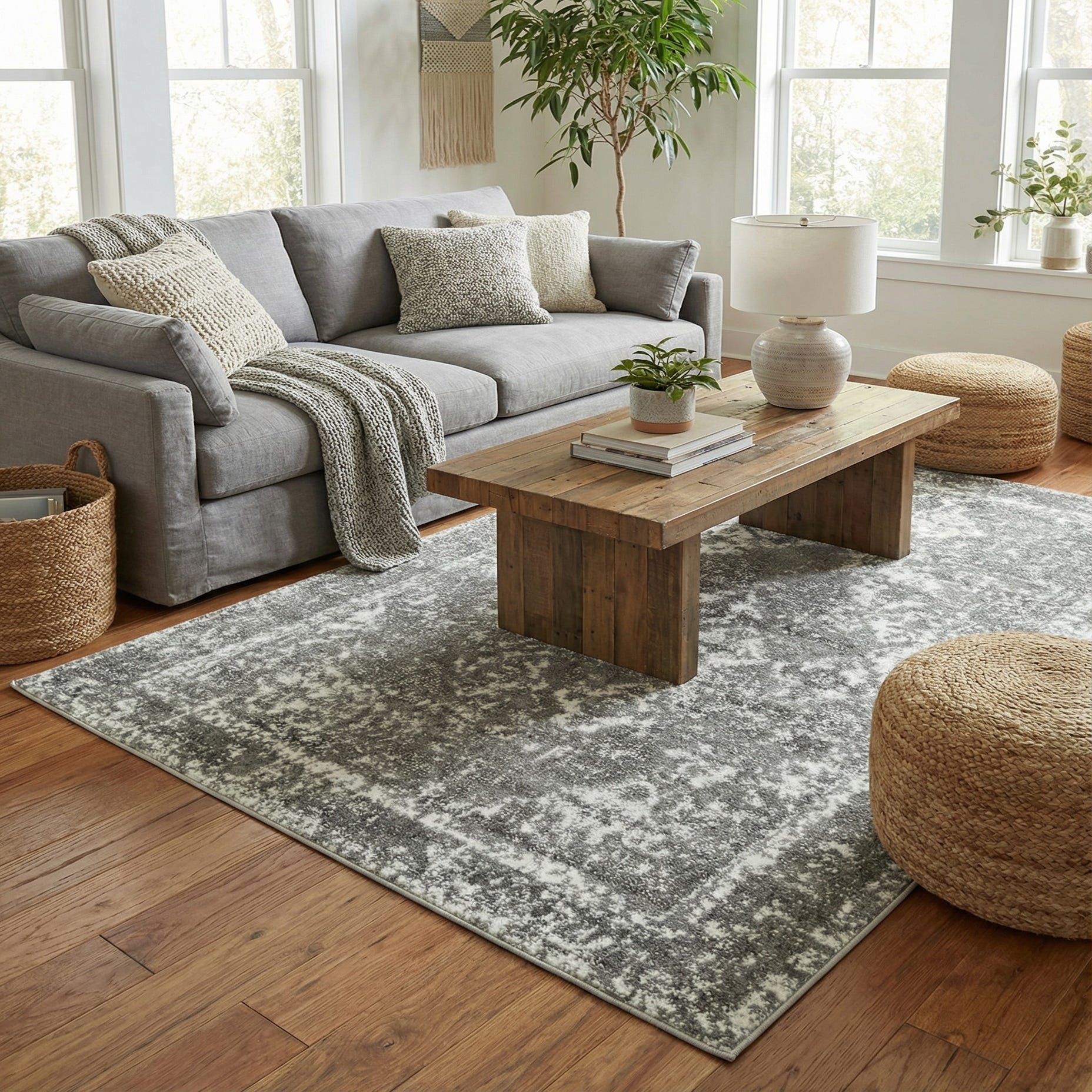 Primary color is Gray. Colors in this rug include: Gray, Ivory.
