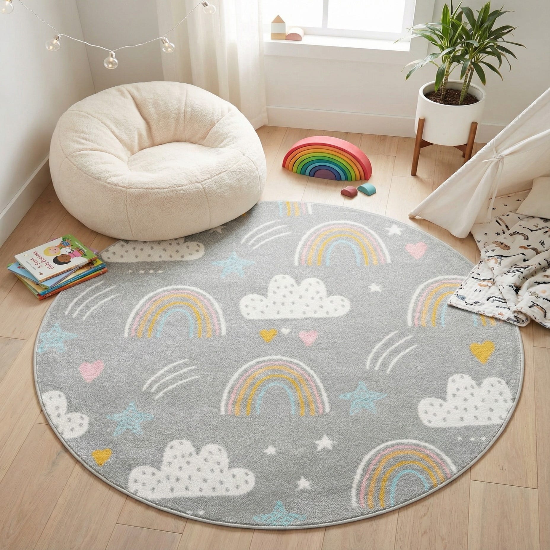 Detail image of 5' 3 x 5' 3 Clouds and Rainbows Whimsy Kids Round Rug