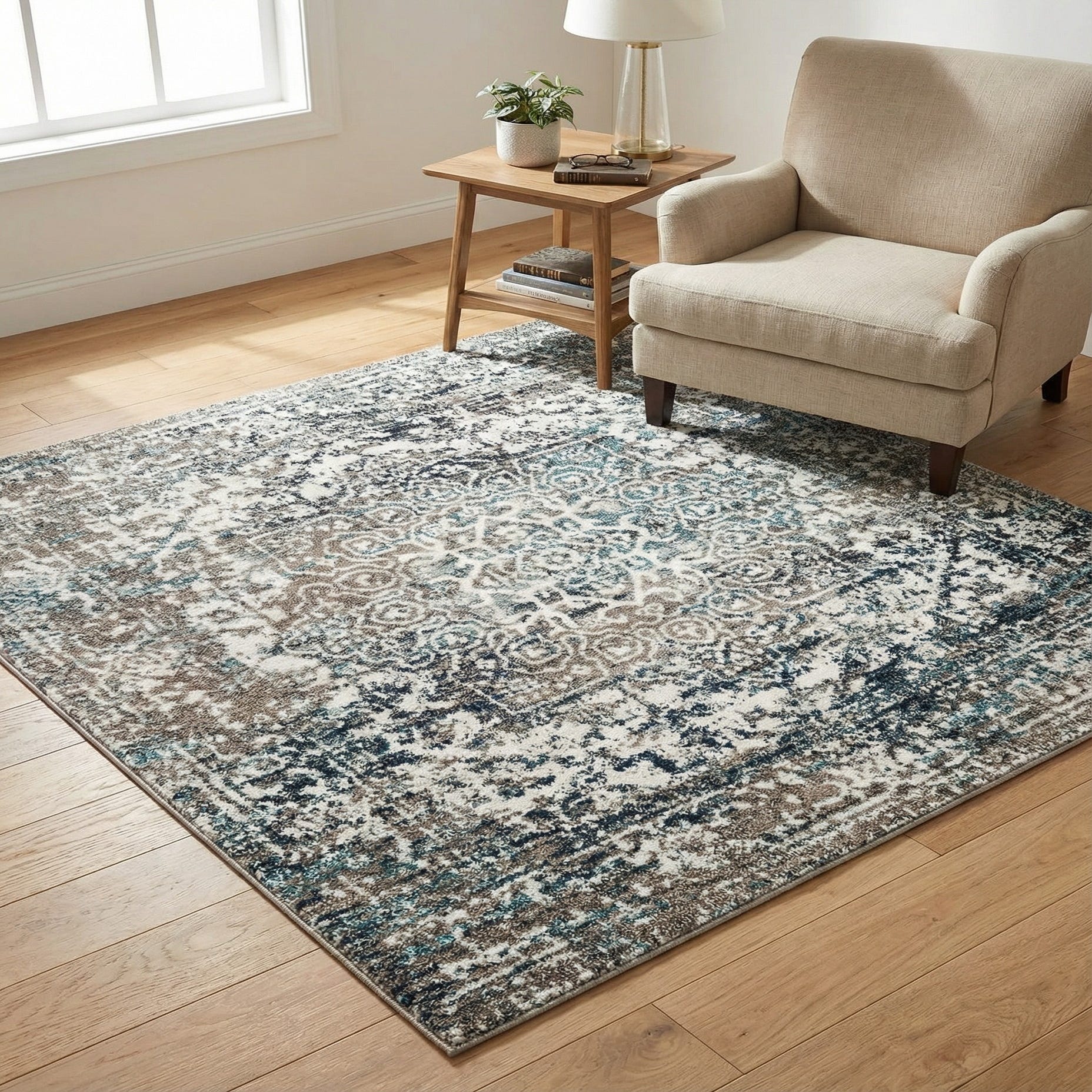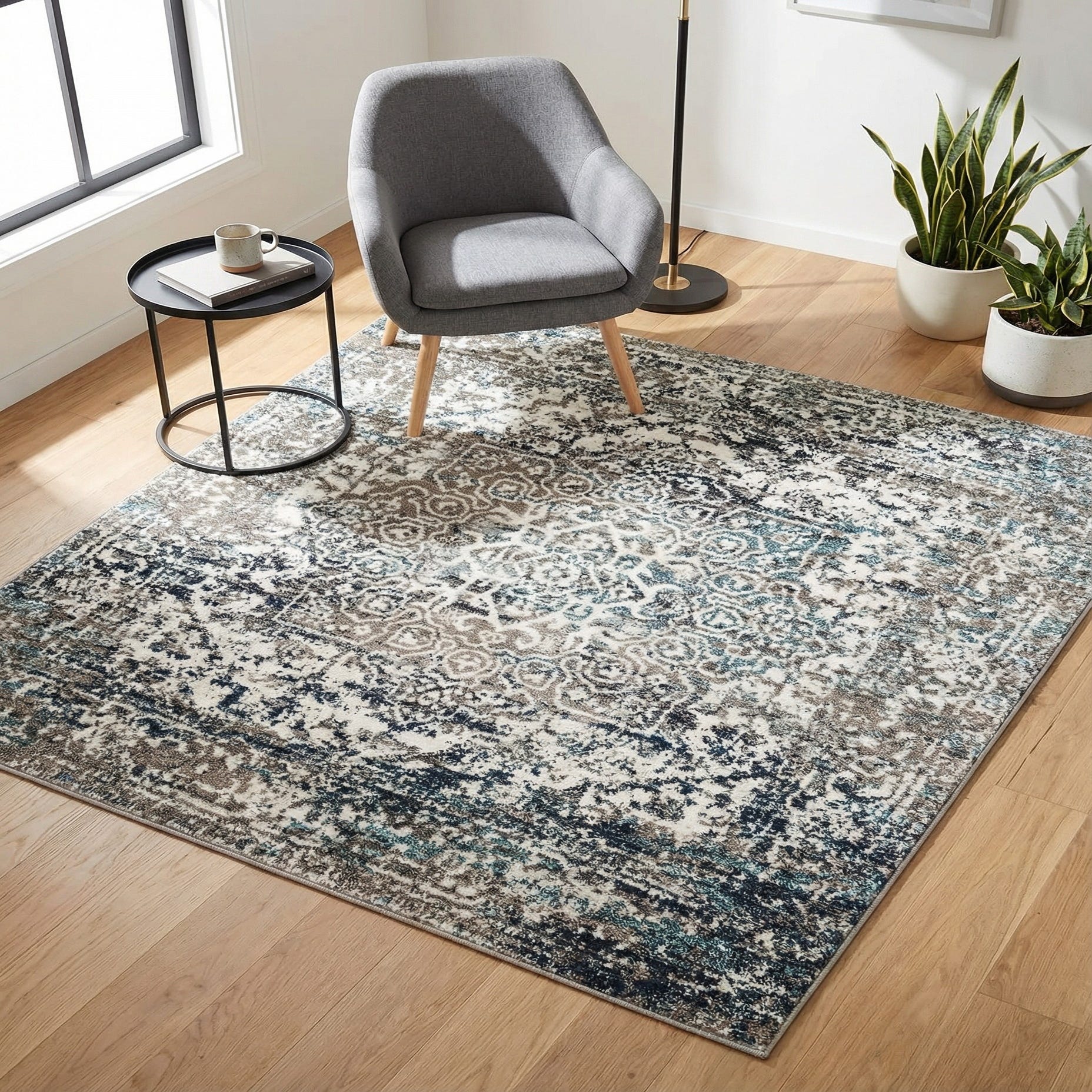 Primary color is Gray. Colors in this rug include: Gray, Blue, Ivory, Navy Blue.
