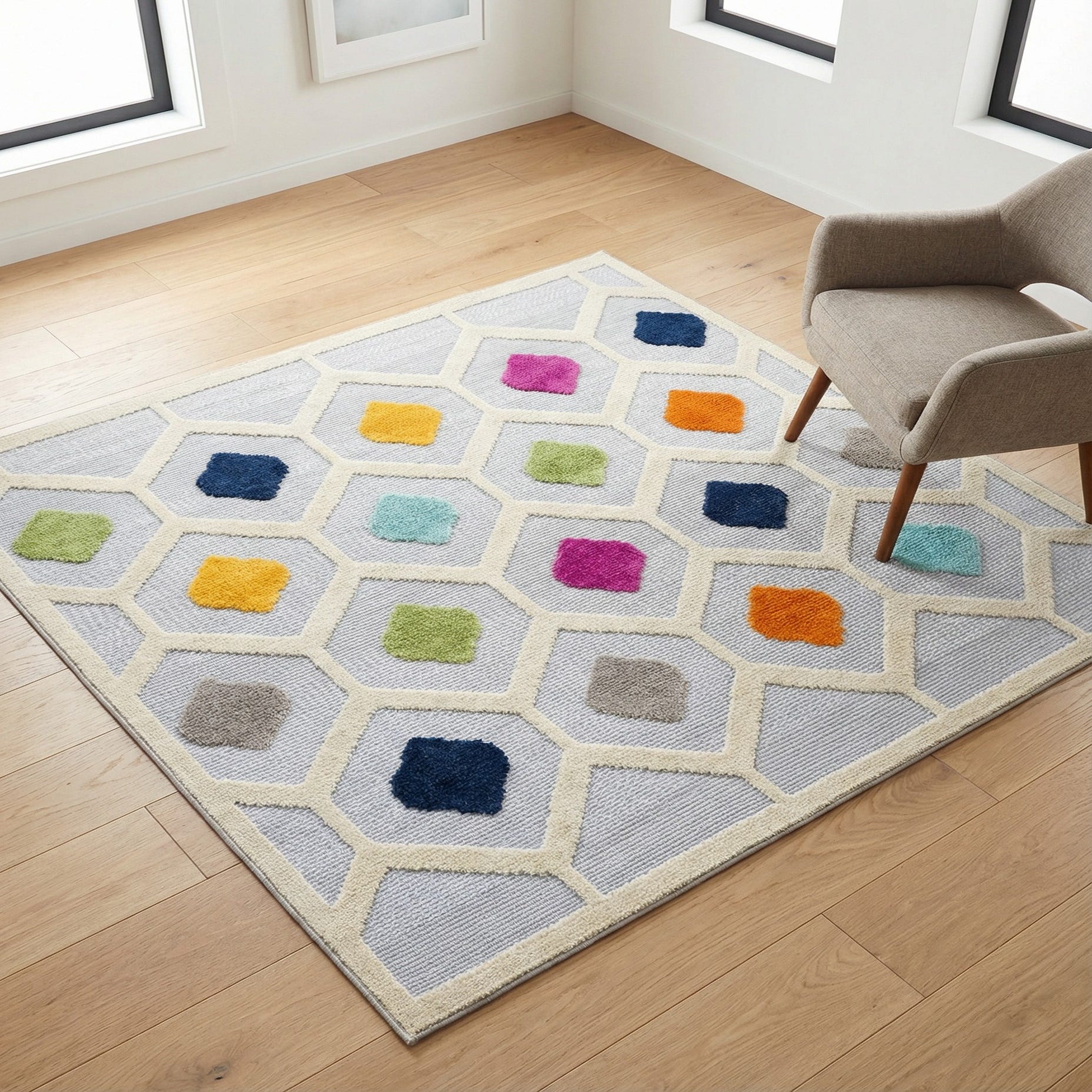 Primary color is Gray. Colors in this rug include: Gray, Gold, Ivory, Light Blue, Light Green, Navy Blue, Pink, Orange.