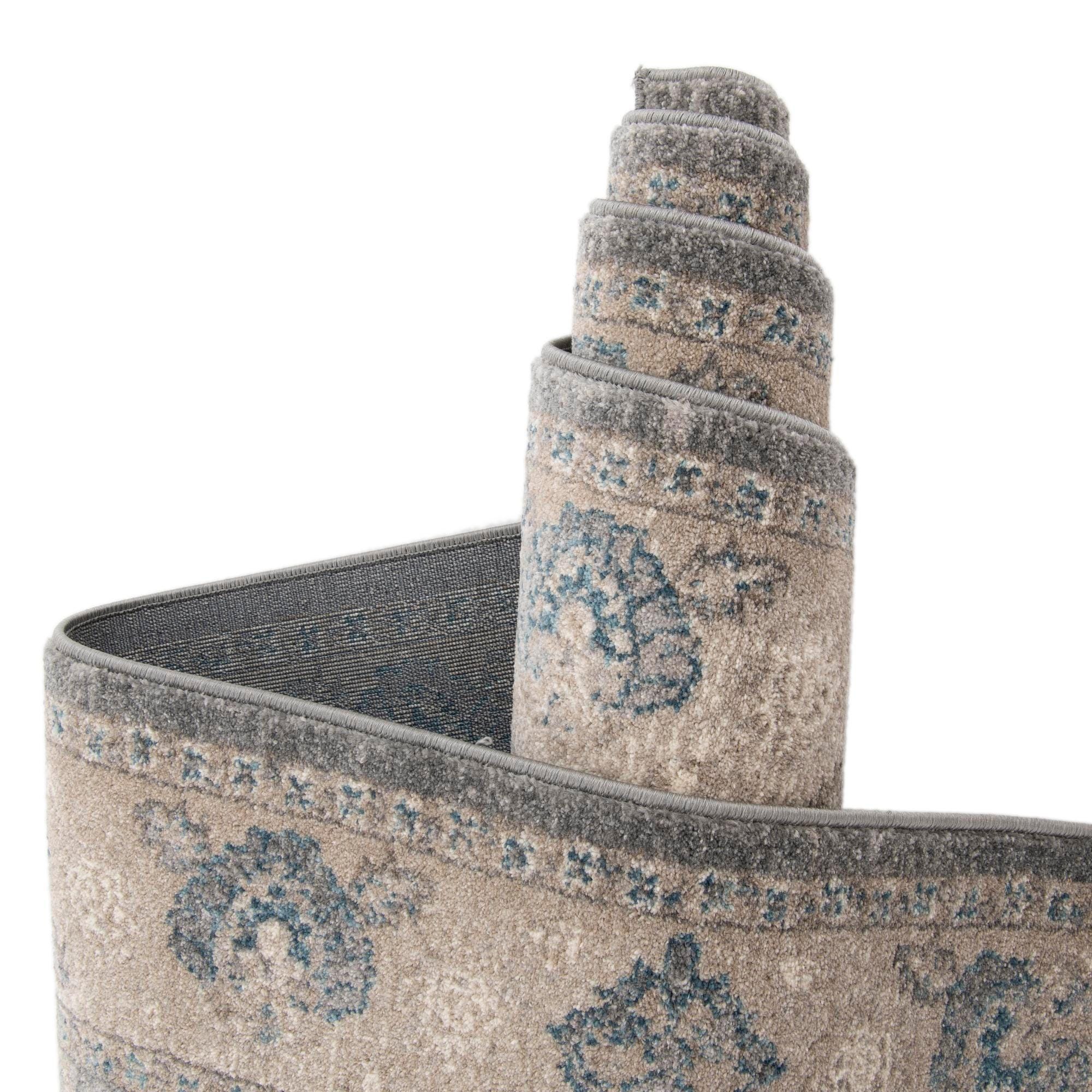 Primary color is Gray. Colors in this rug include: Gray, Light Blue, Ivory.