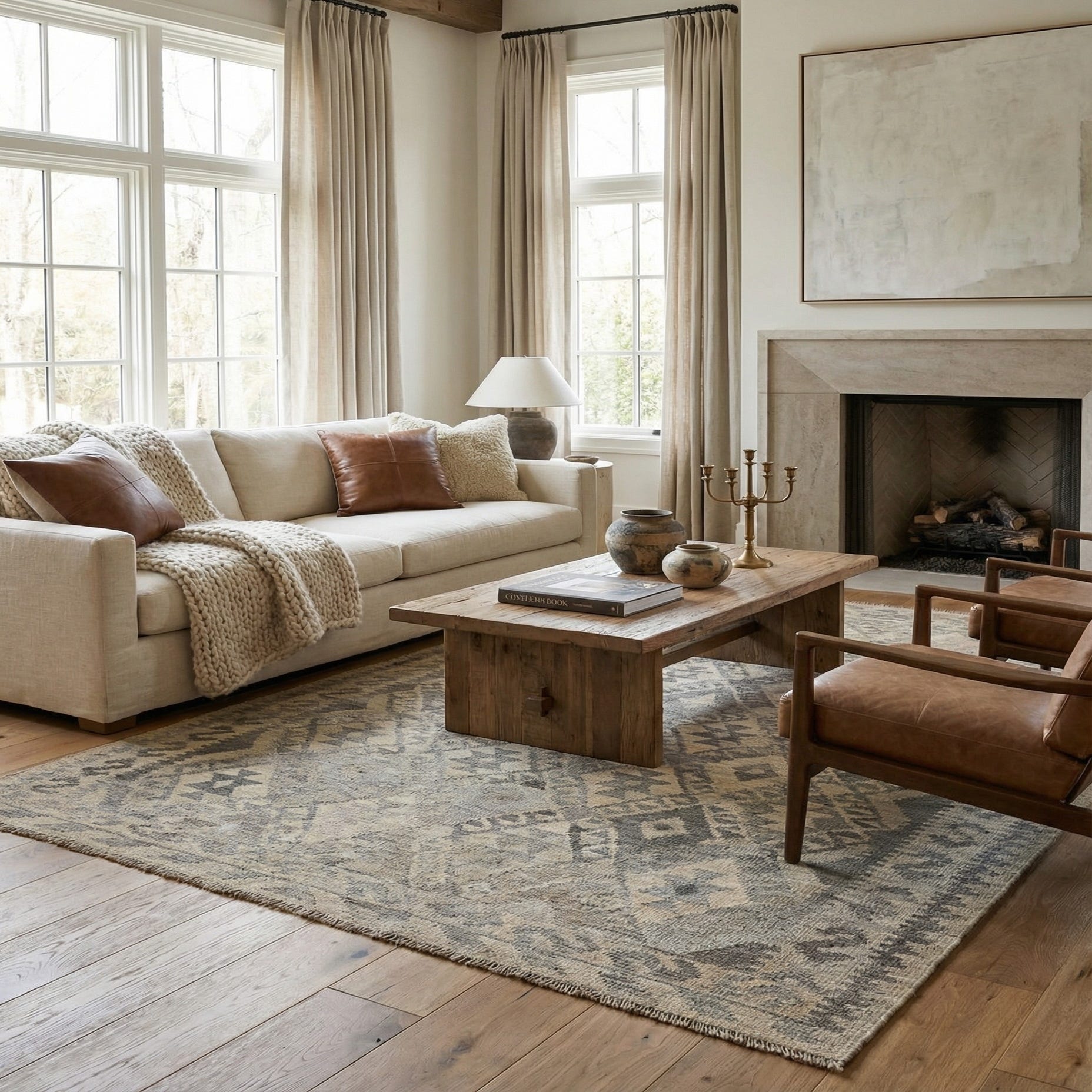 Primary color is Gray. Colors in this rug include: Gray, Beige, Light Brown.
