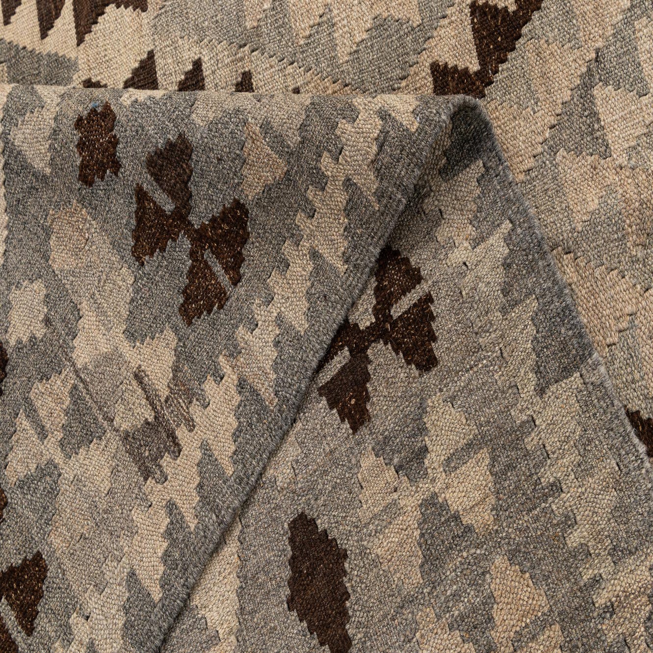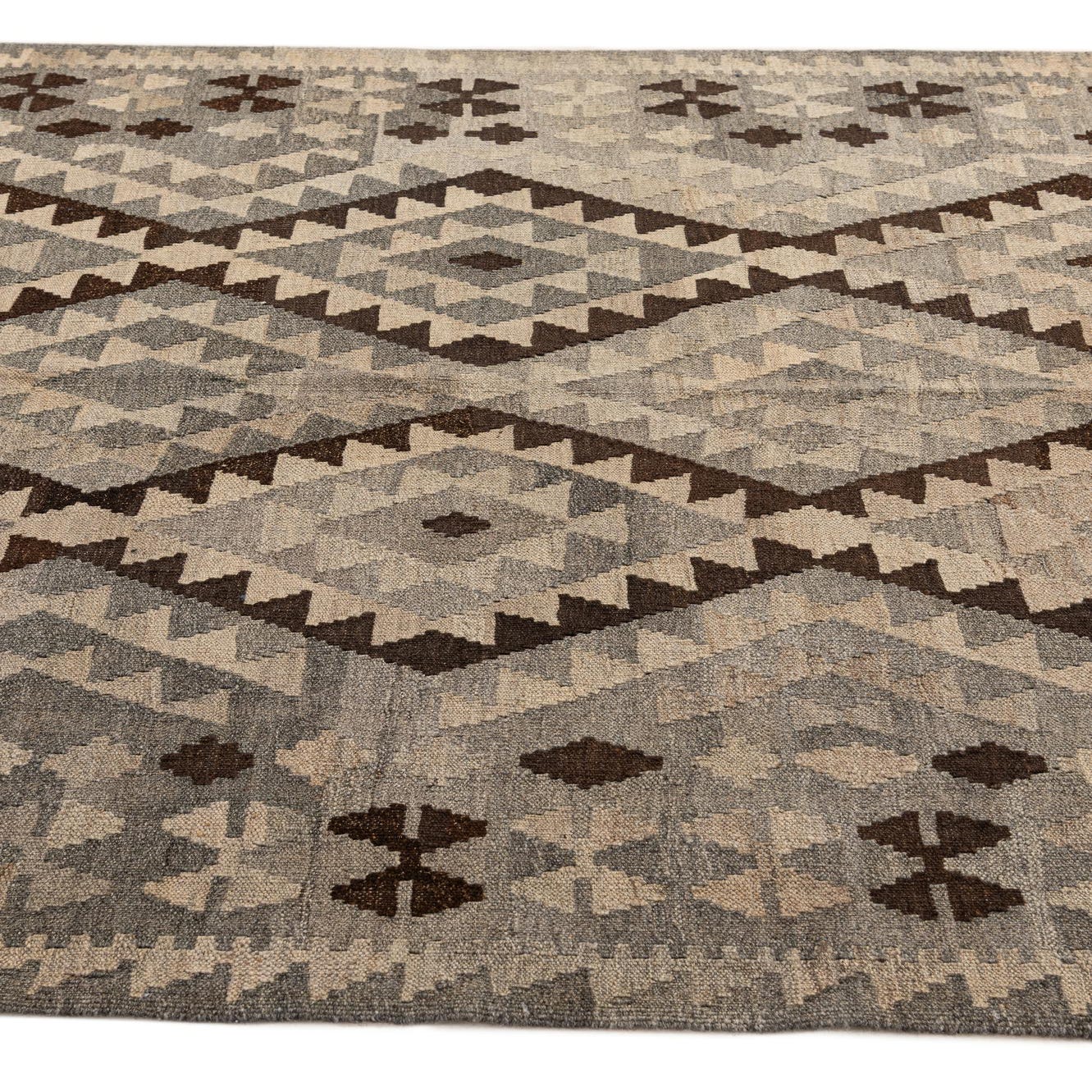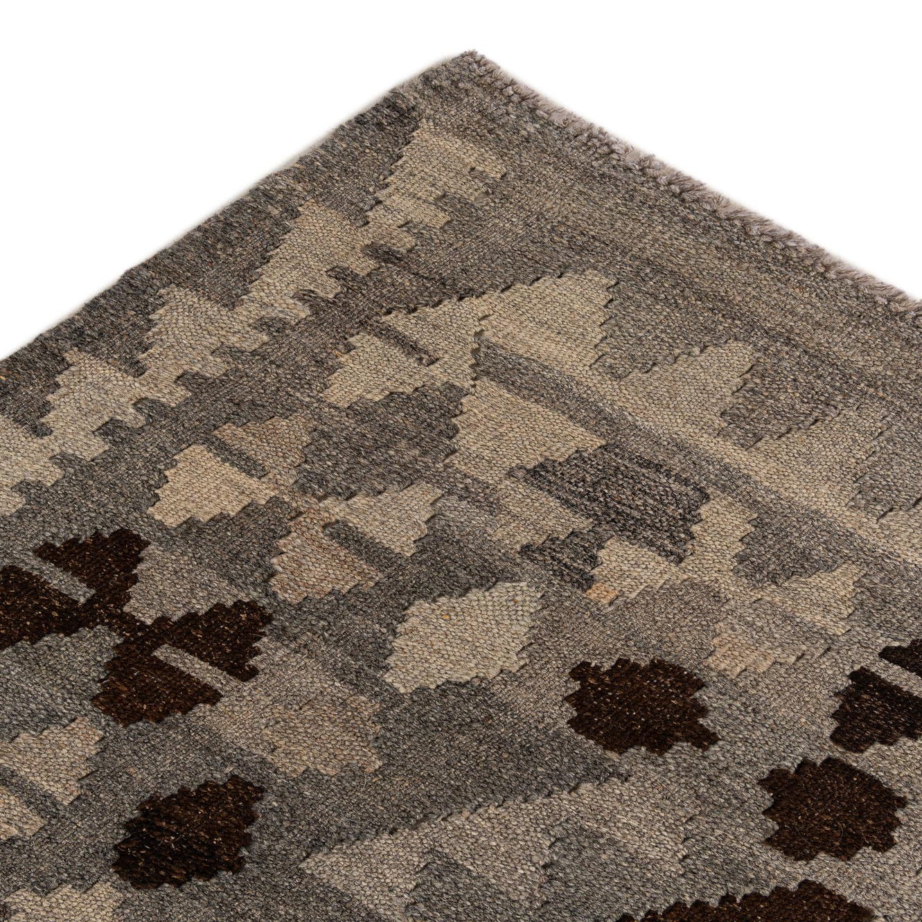 Primary color is Gray. Colors in this rug include: Gray, Beige, Brown, Light Brown.