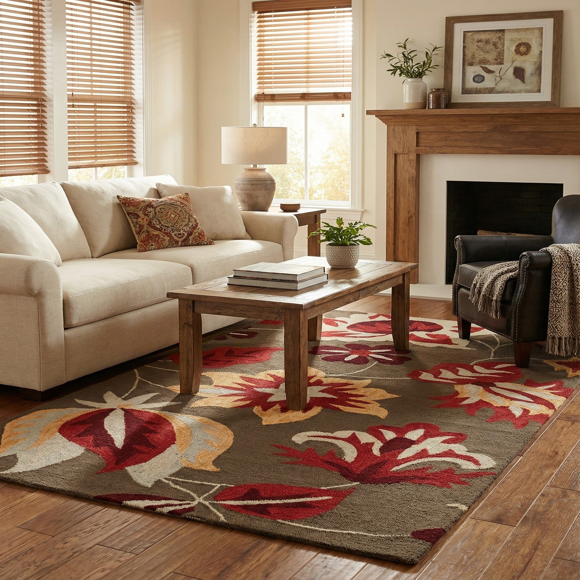 Primary color is Gray. Colors in this rug include: Gray, Burgundy, Ivory, Light Blue, Red, Orange.