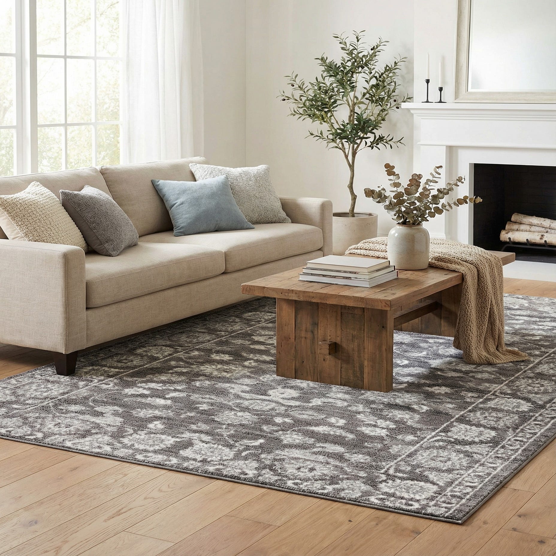 Primary color is Gray. Colors in this rug include: Gray, Ivory.