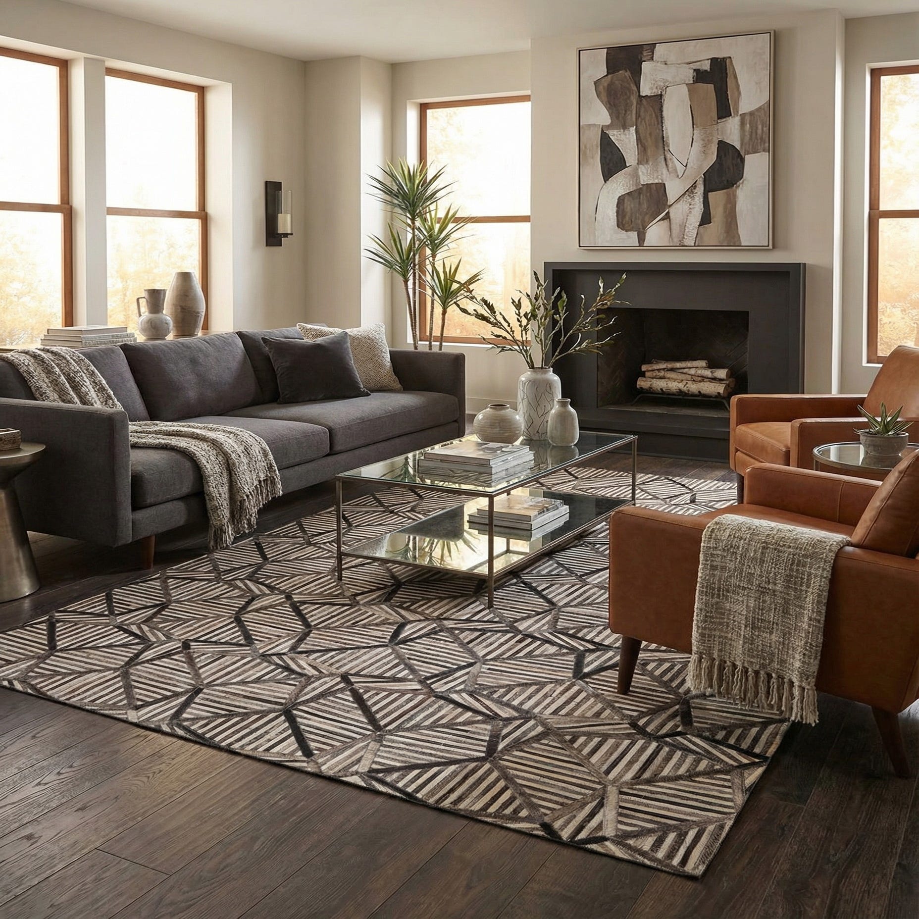 Primary color is Gray. Colors in this rug include: Gray, Black, Brown, Ivory.
