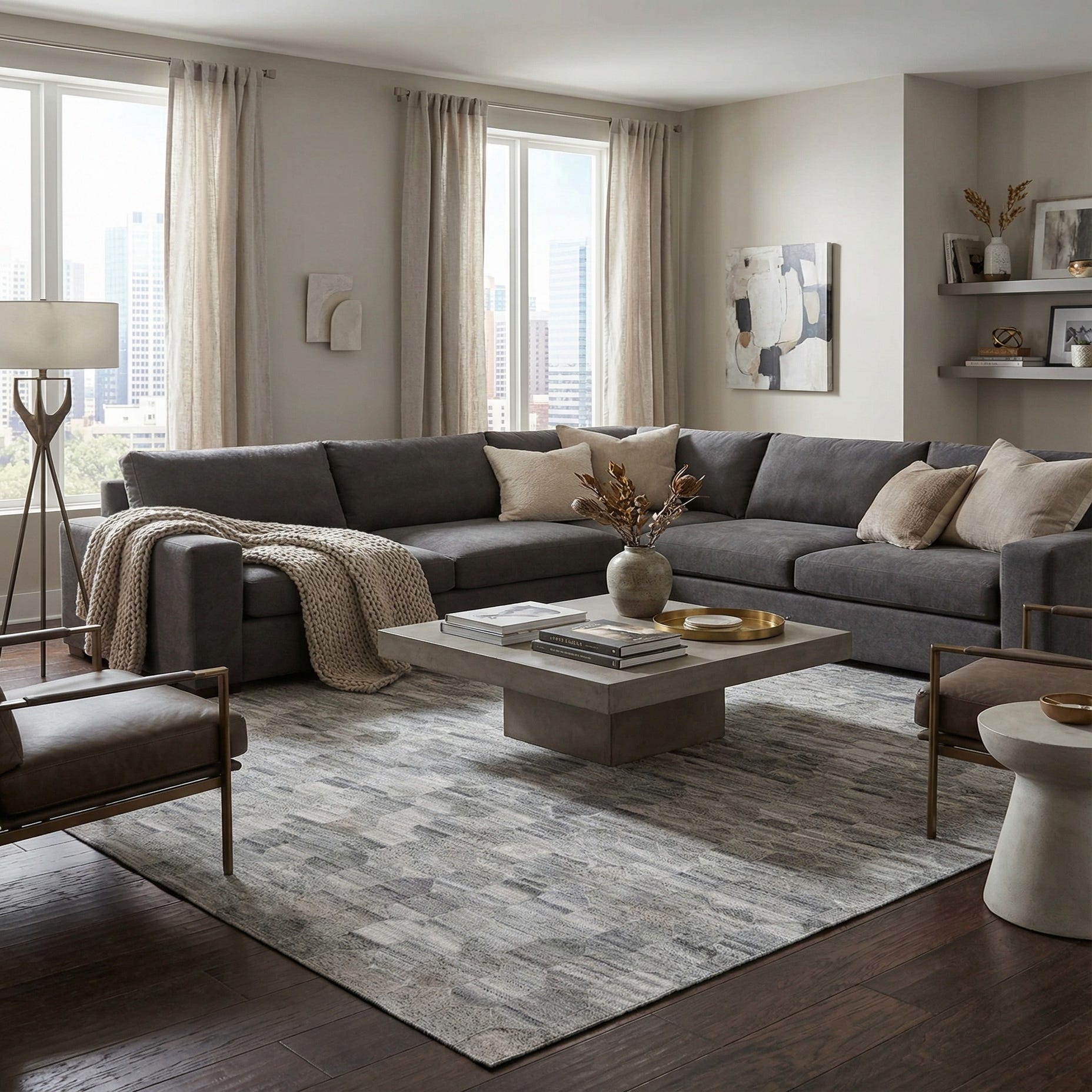Primary color is Gray. Colors in this rug include: Gray, Black, Ivory.