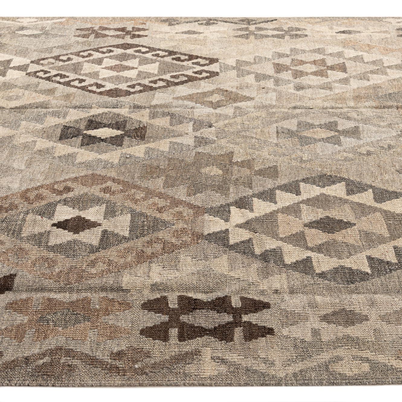 Primary color is Gray. Colors in this rug include: Gray, Beige, Brown, Light Brown.