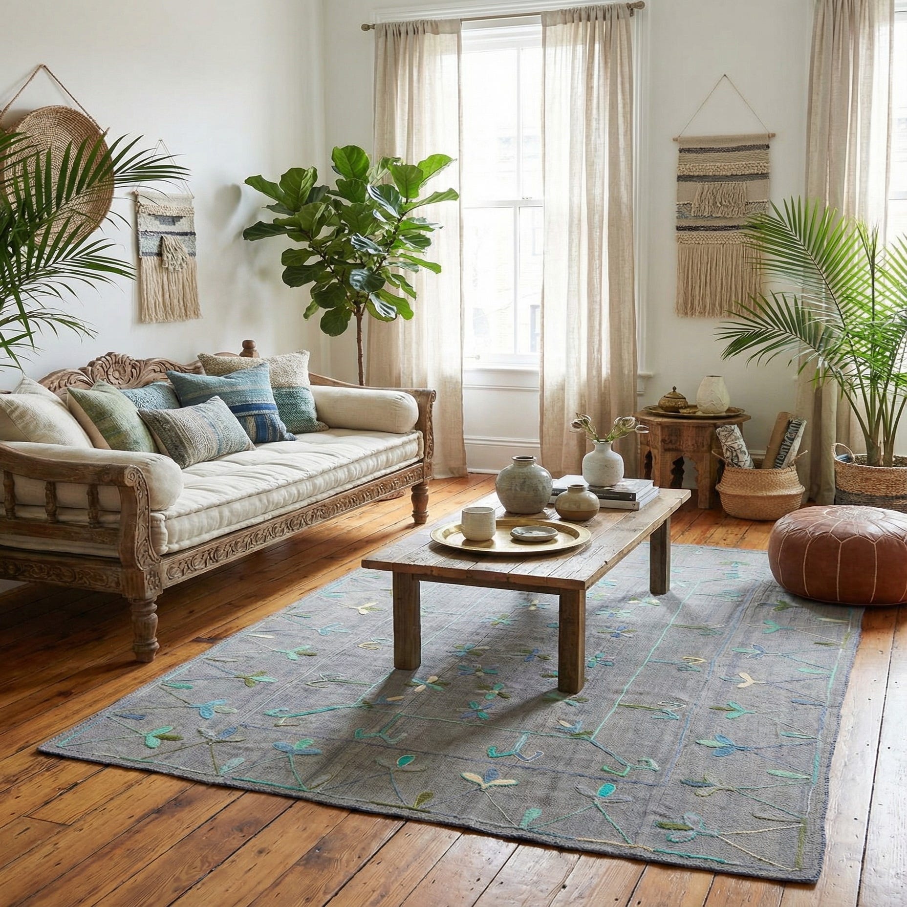Primary color is Gray. Colors in this rug include: Gray, Blue, Ivory, Green.