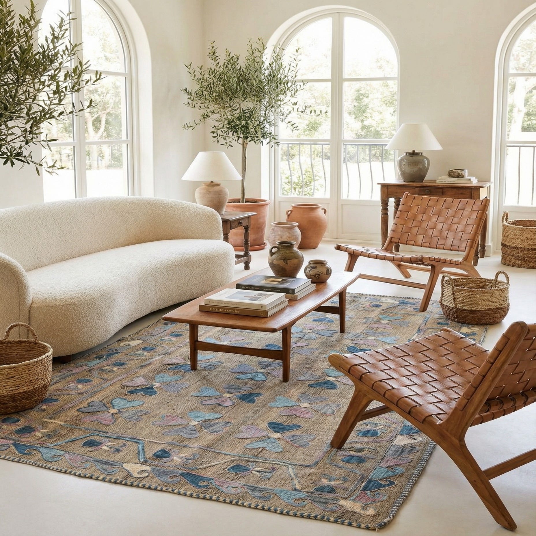 Primary color is Gray. Colors in this rug include: Gray, Blue, Ivory, Violet, Navy Blue.