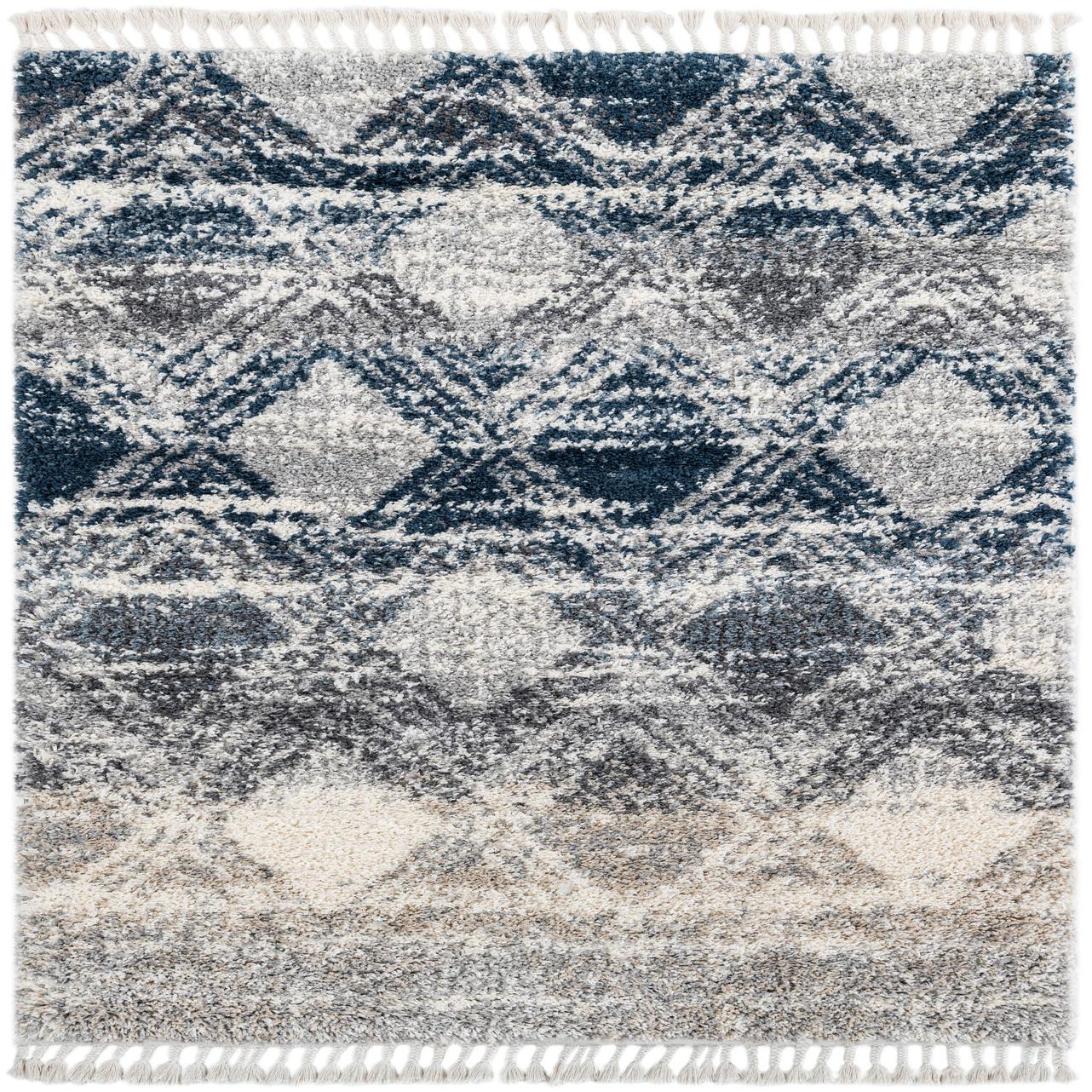 Primary color is Gray. Colors in this rug include: Gray, Ivory, Navy Blue.