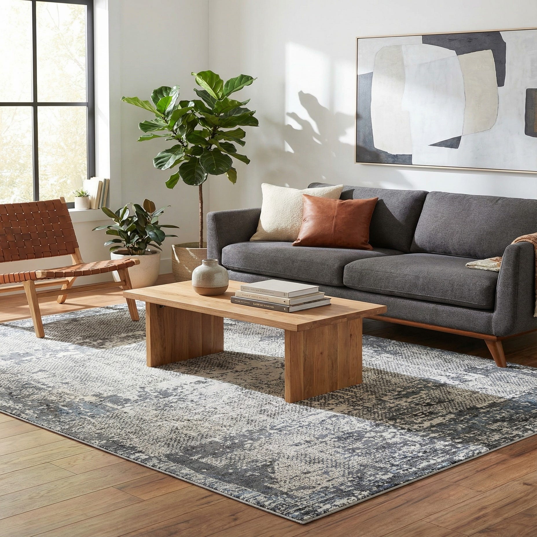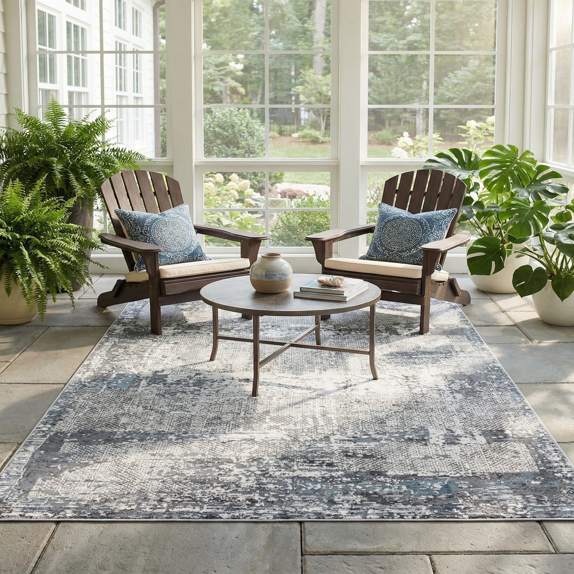 Primary color is Gray. Colors in this rug include: Gray, Blue.