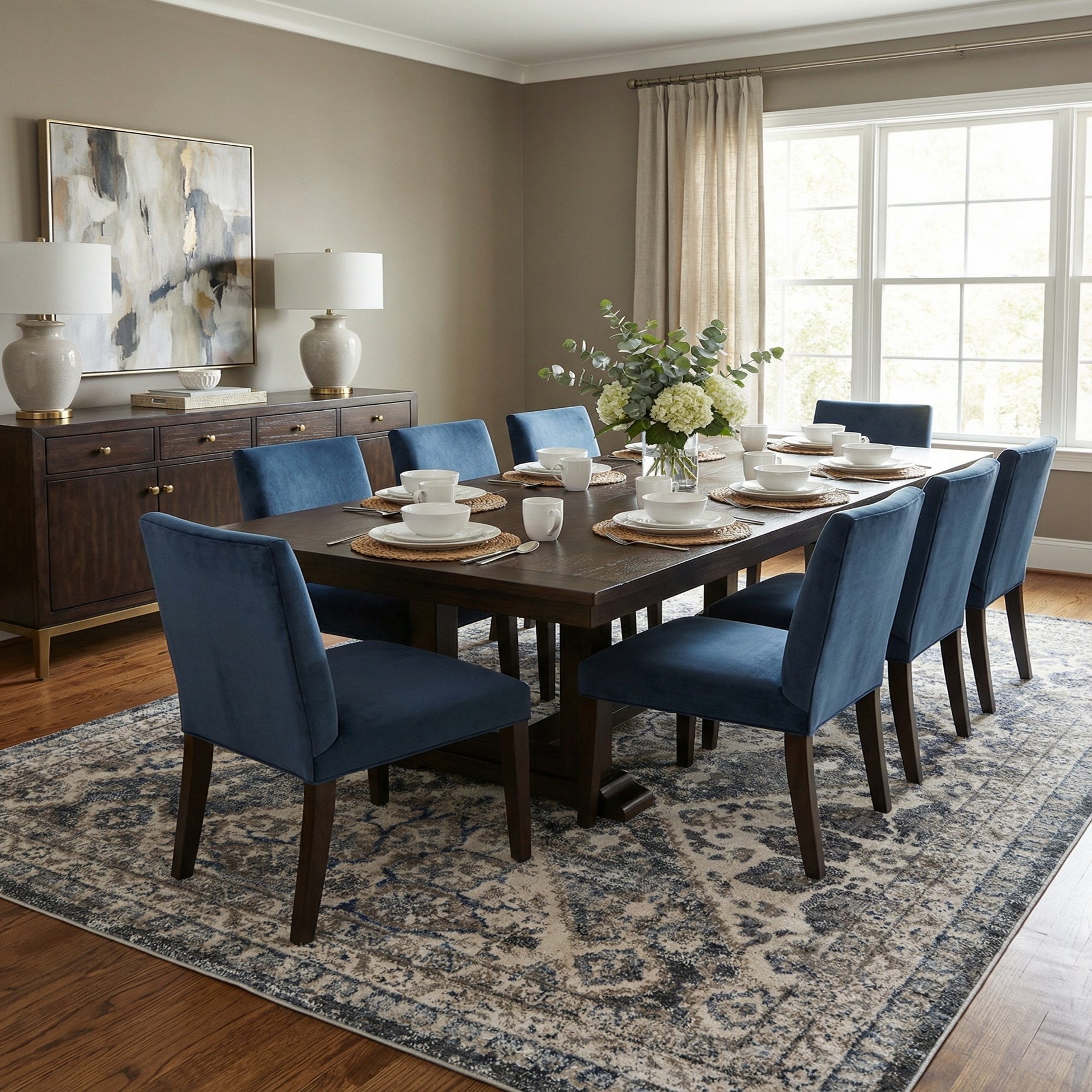 Primary color is Gray. Colors in this rug include: Gray, Beige, Ivory, Navy Blue.