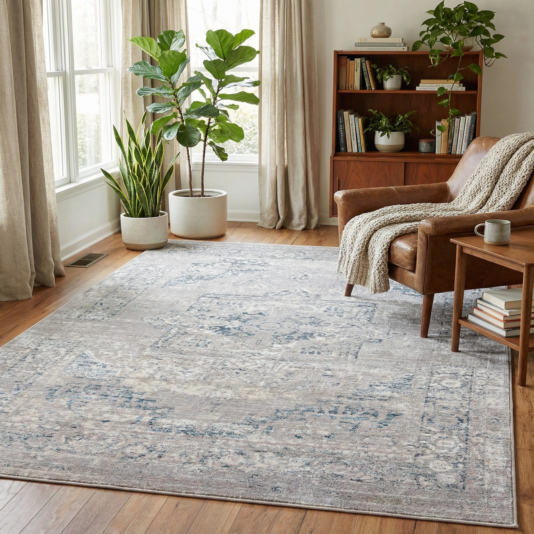 Primary color is Gray. Colors in this rug include: Gray, Blue, Navy Blue, Ivory.