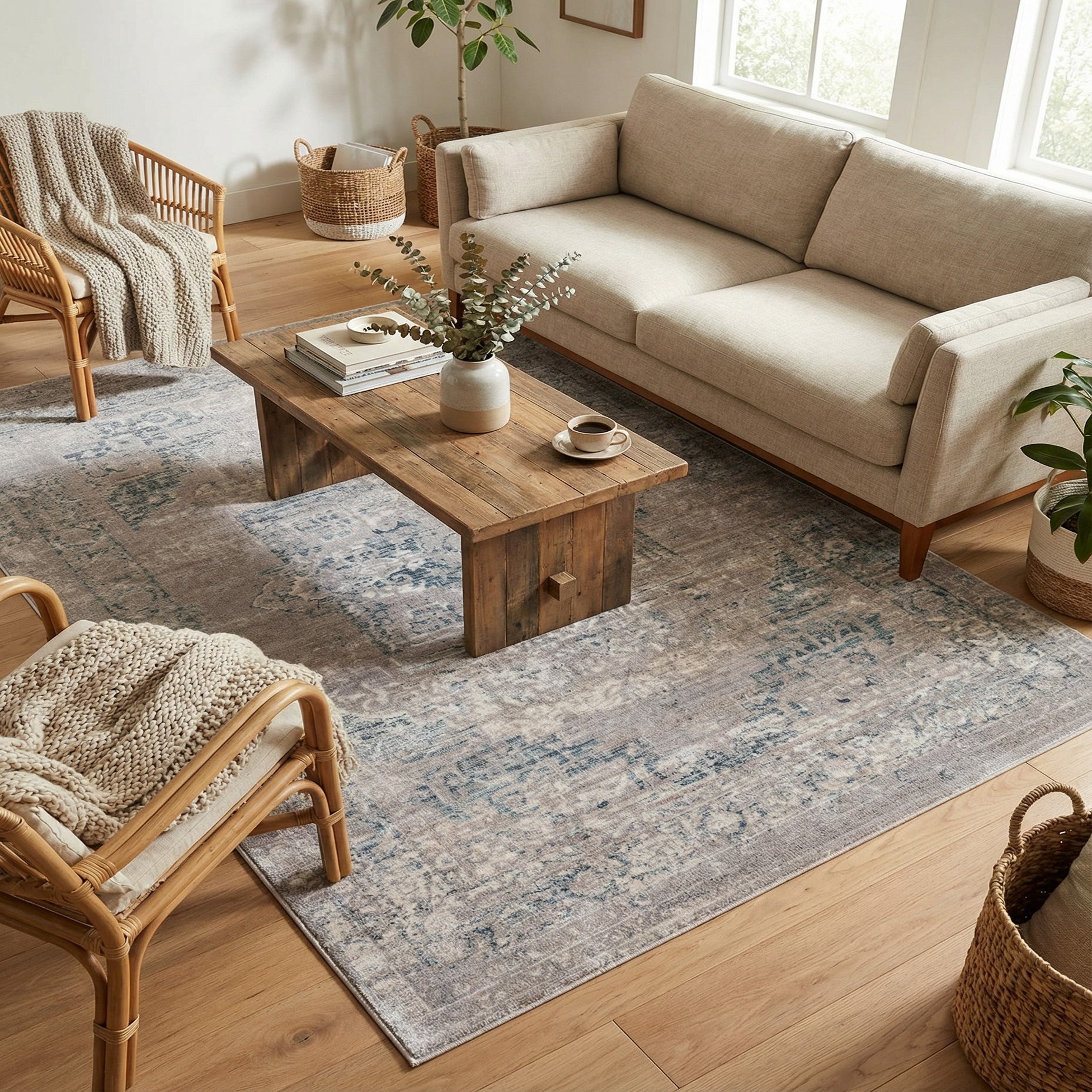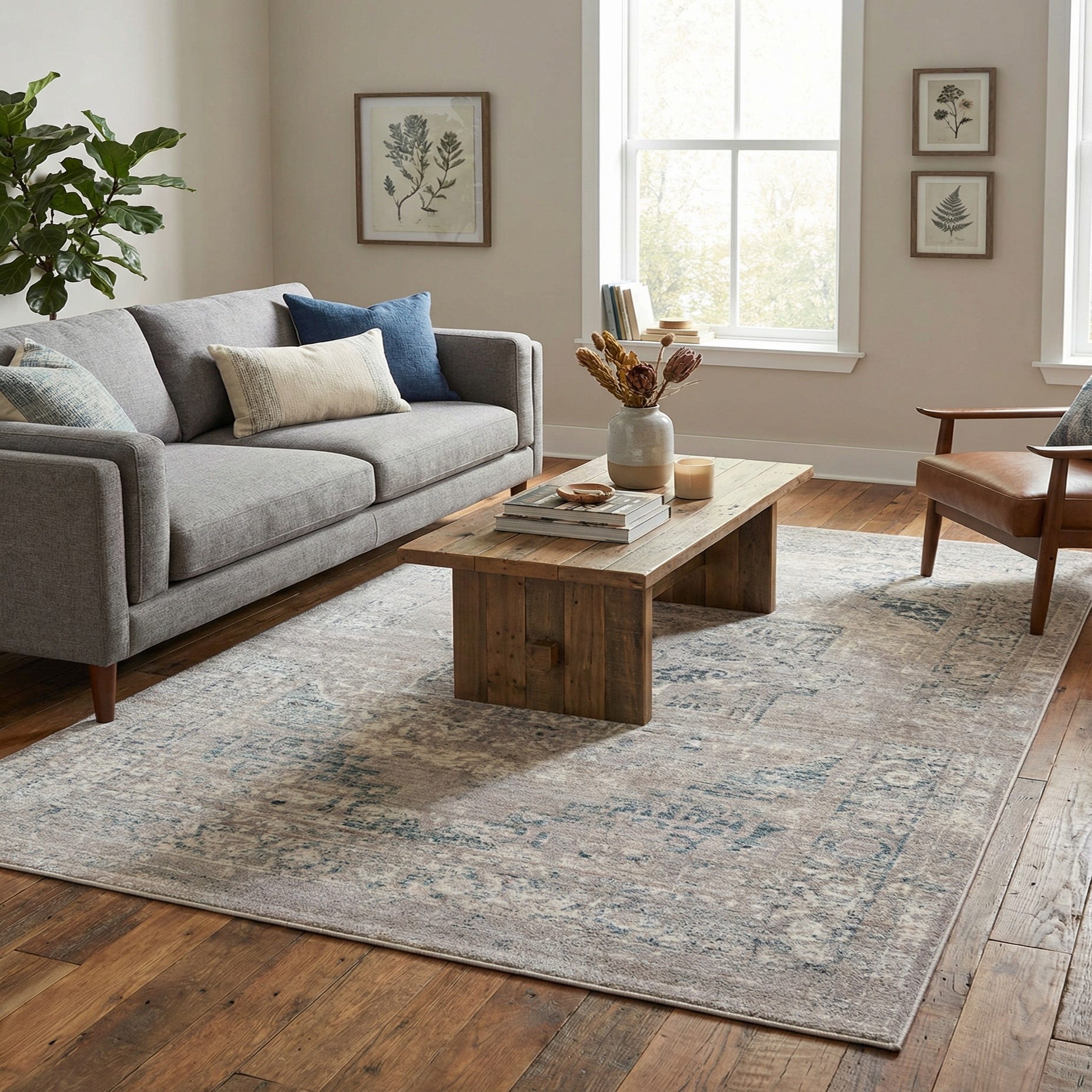 Primary color is Gray. Colors in this rug include: Gray, Blue, Navy Blue, Ivory.