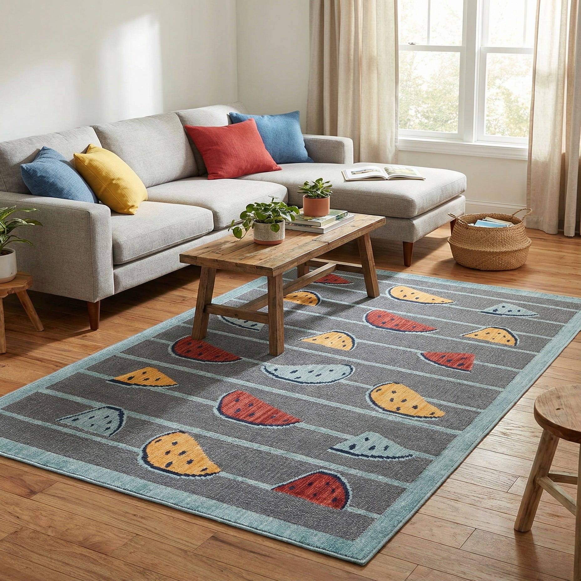 Primary color is Gray. Colors in this rug include: Gray, Light Blue, Navy Blue, Terracotta, Yellow.
