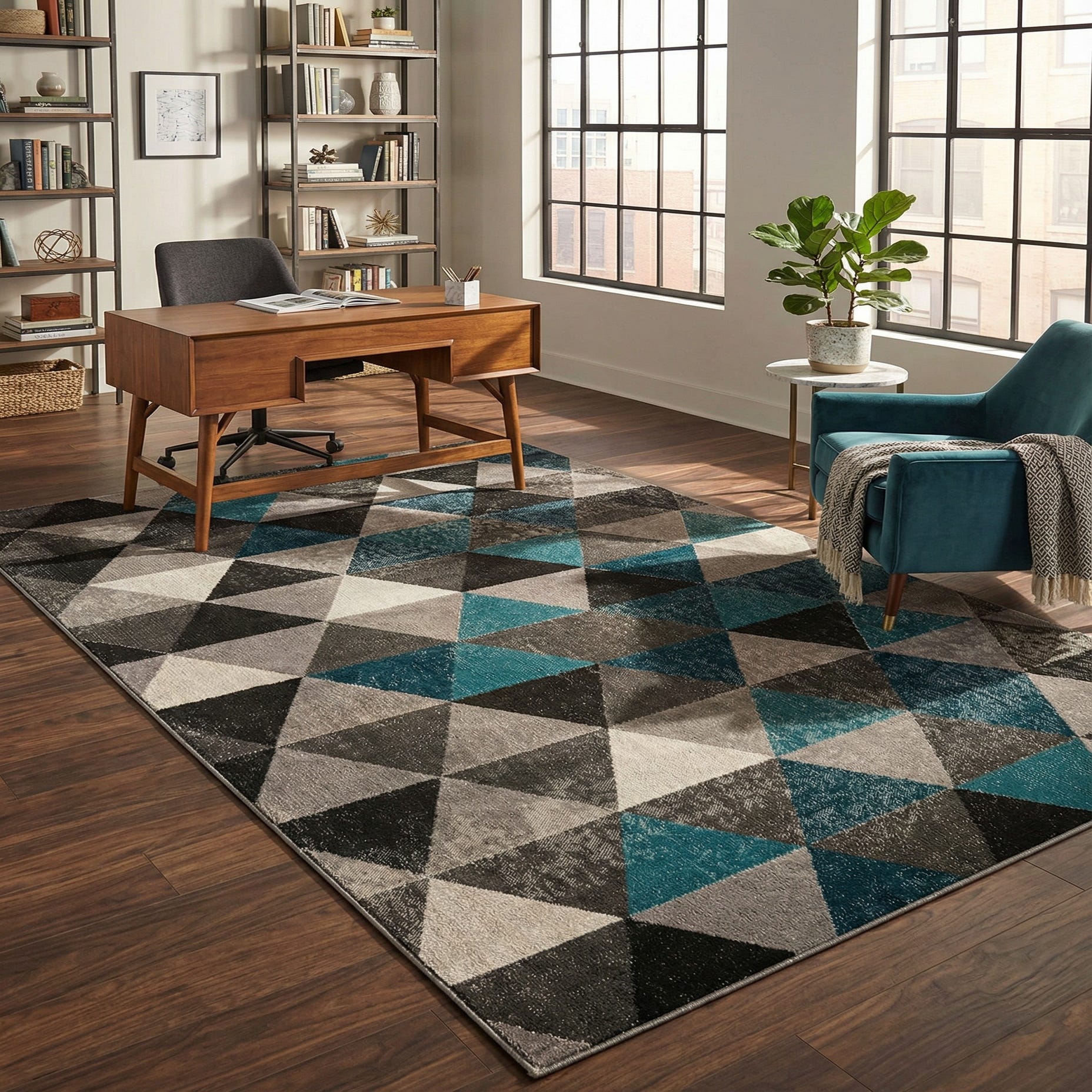 Primary color is Gray. Colors in this rug include: Gray, Black, Blue, Ivory.