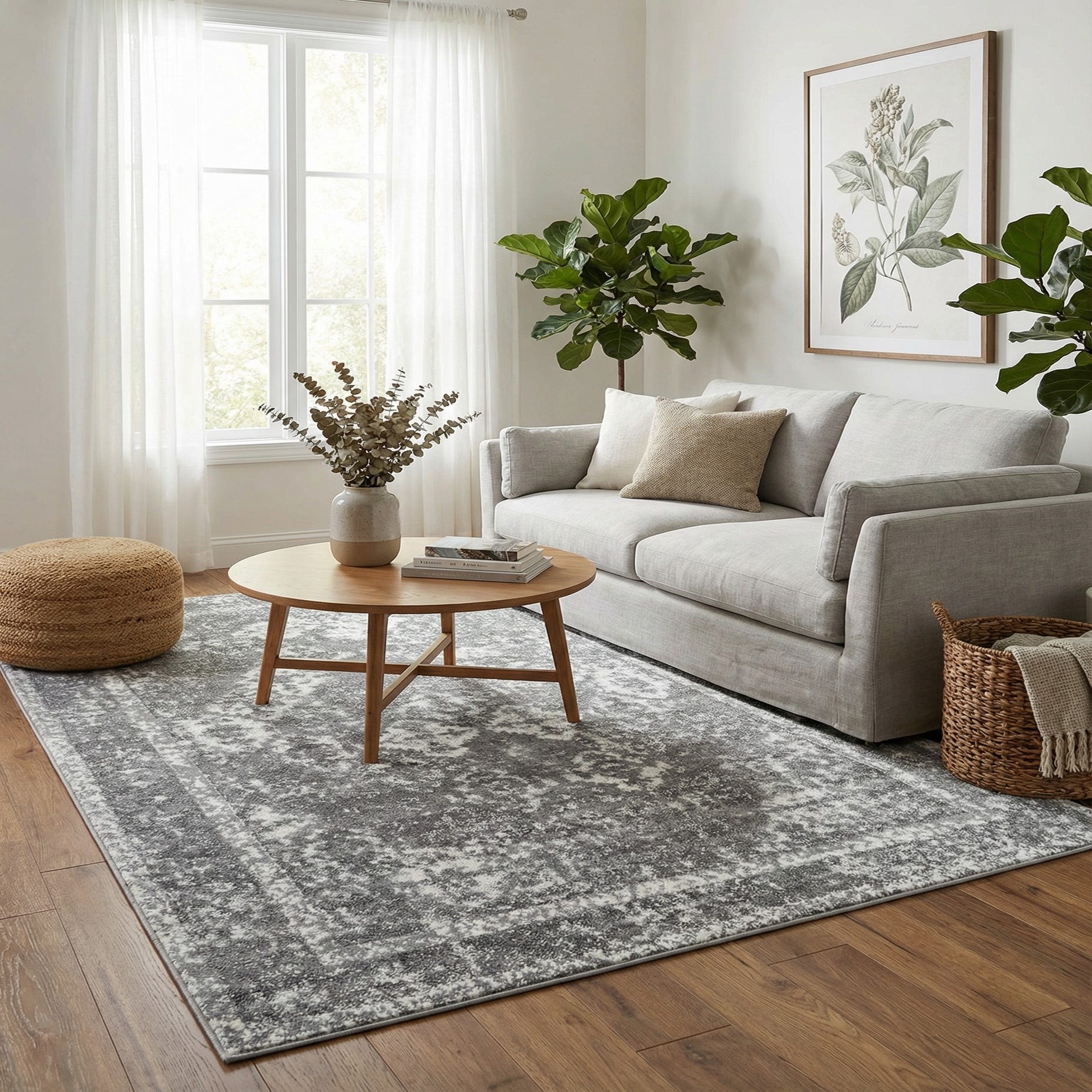 Primary color is Gray. Colors in this rug include: Gray, Ivory.