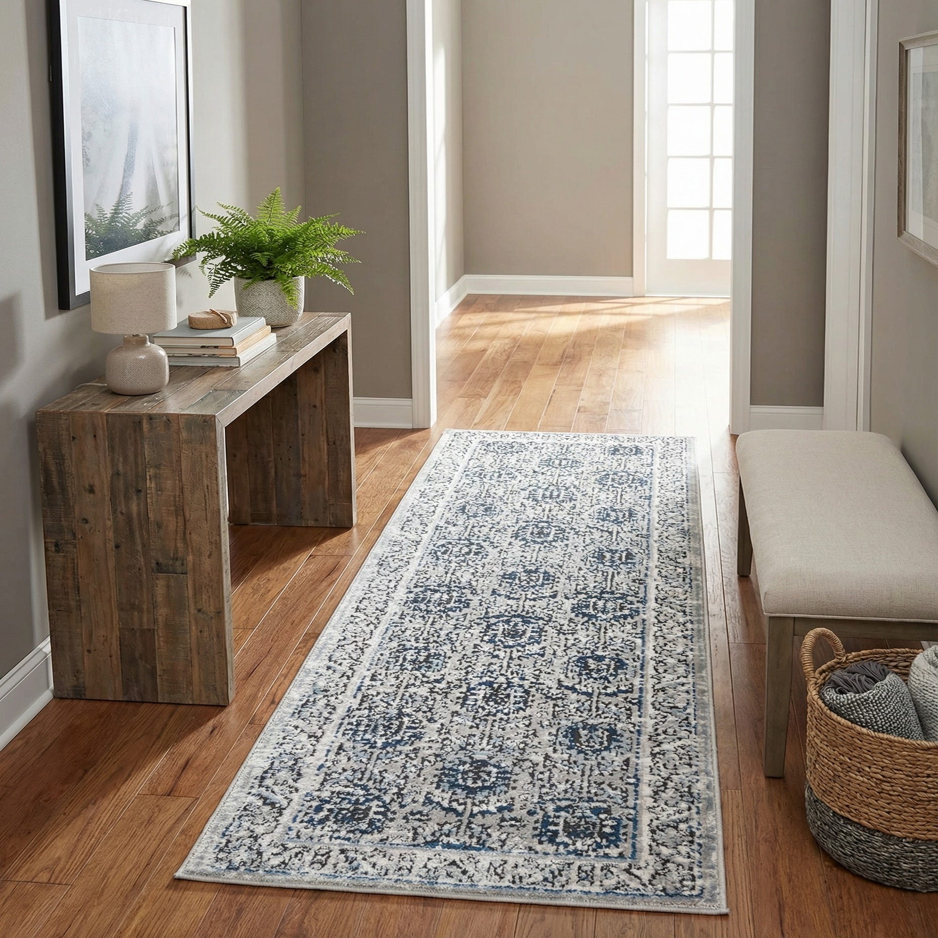 Primary color is Gray. Colors in this rug include: Gray, Blue, Ivory, Black, Light Blue.