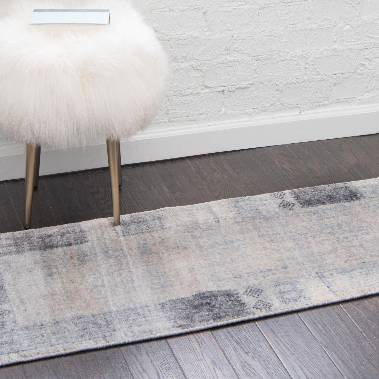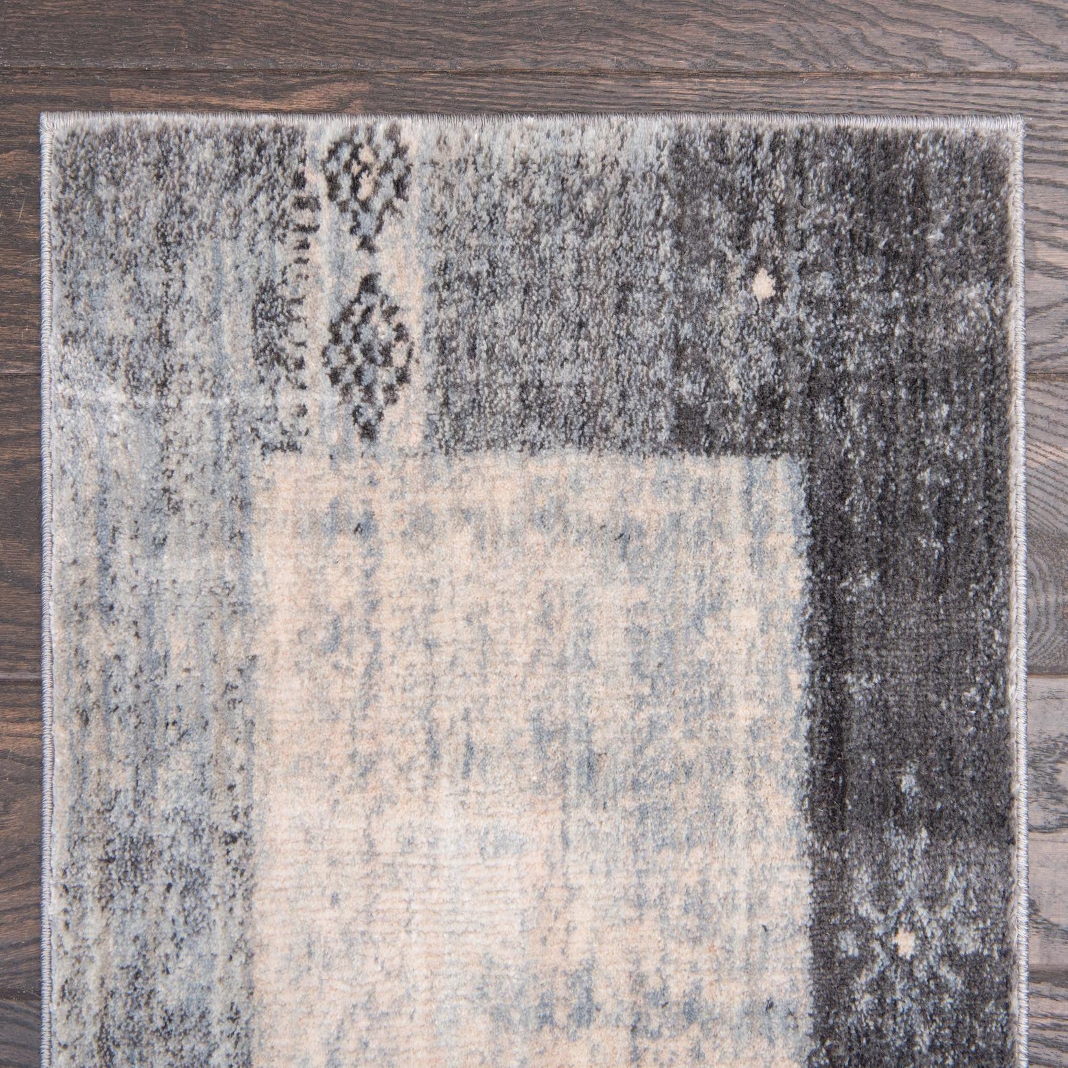 Primary color is Gray. Colors in this rug include: Gray, Beige, Light Blue.