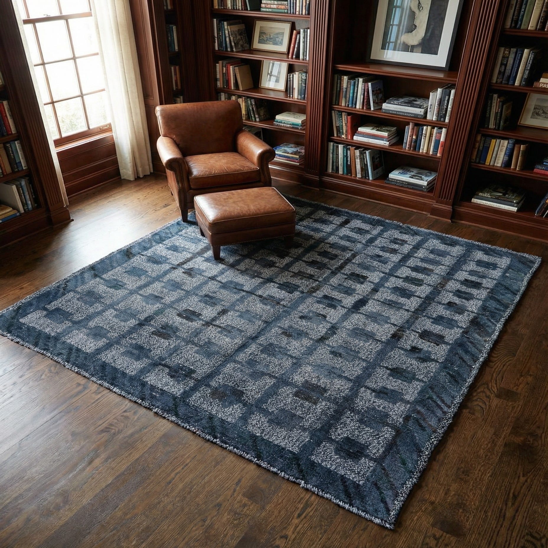Primary color is Gray. Colors in this rug include: Gray, Navy Blue.