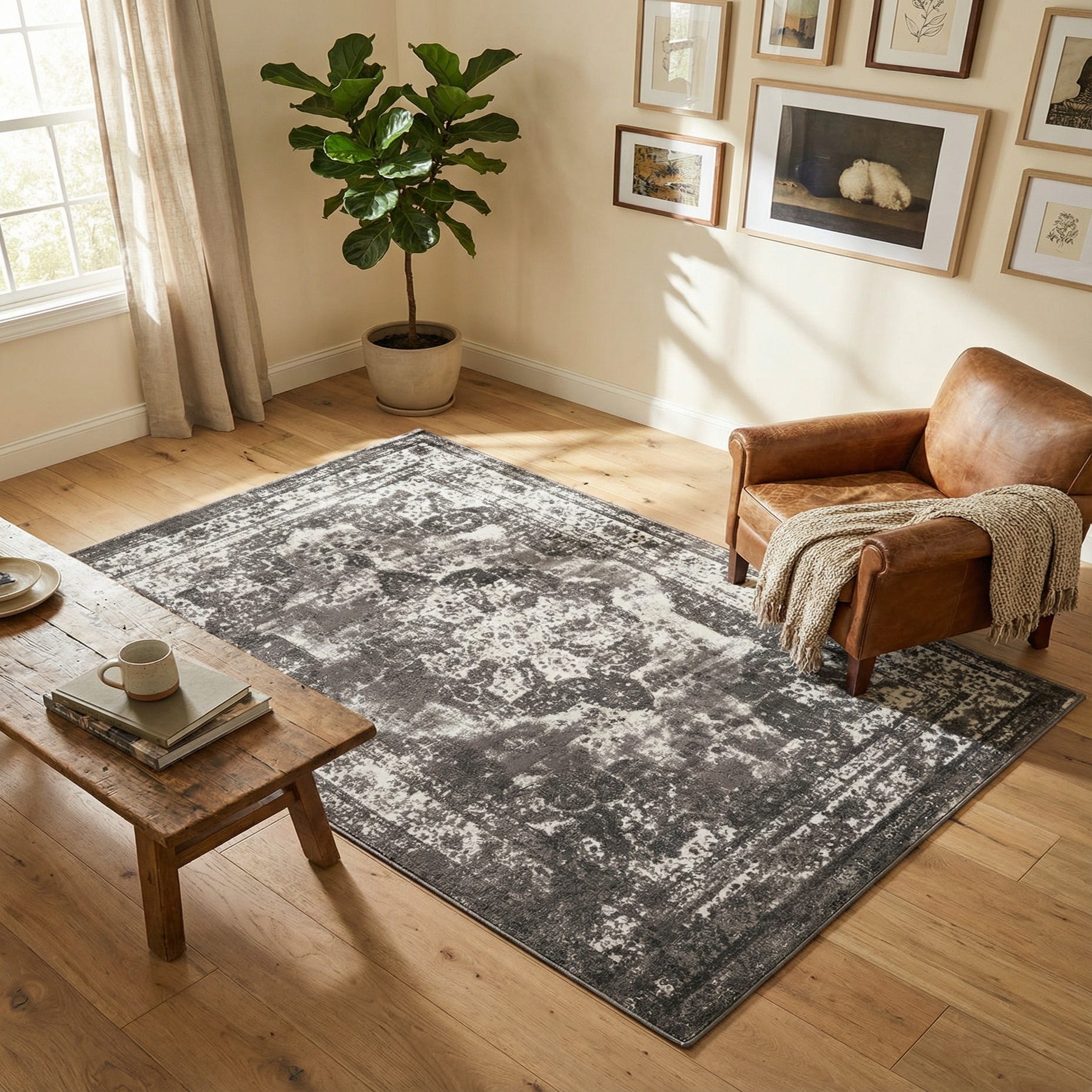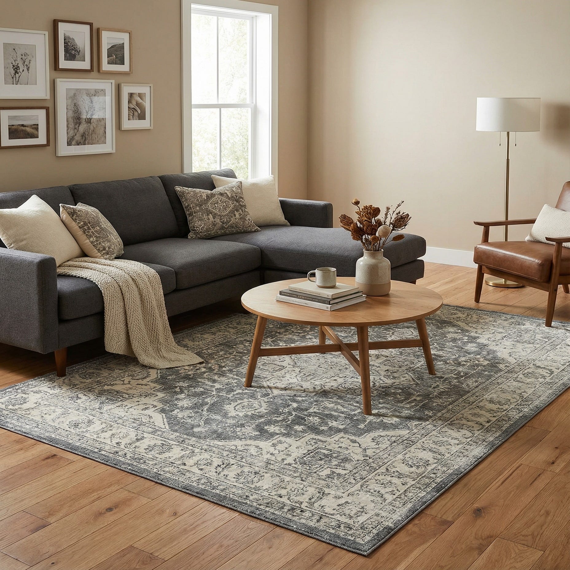 Primary color is Gray. Colors in this rug include: Gray, Beige.