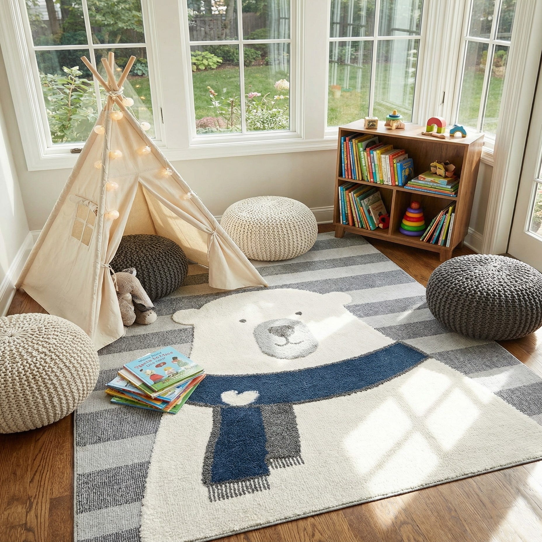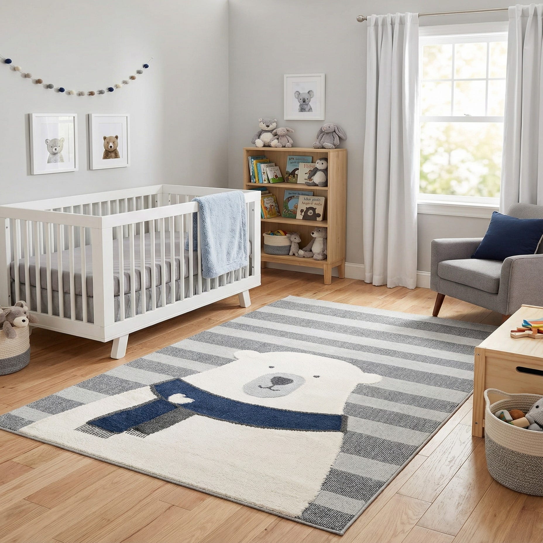 Primary color is Gray. Colors in this rug include: Gray, Ivory, Navy Blue.