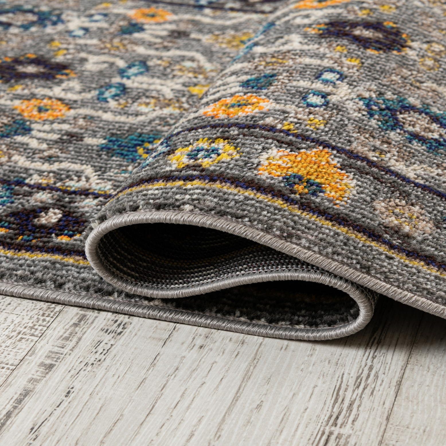 Primary color is Gray. Colors in this rug include: Gray, Black, Gold, Navy Blue.