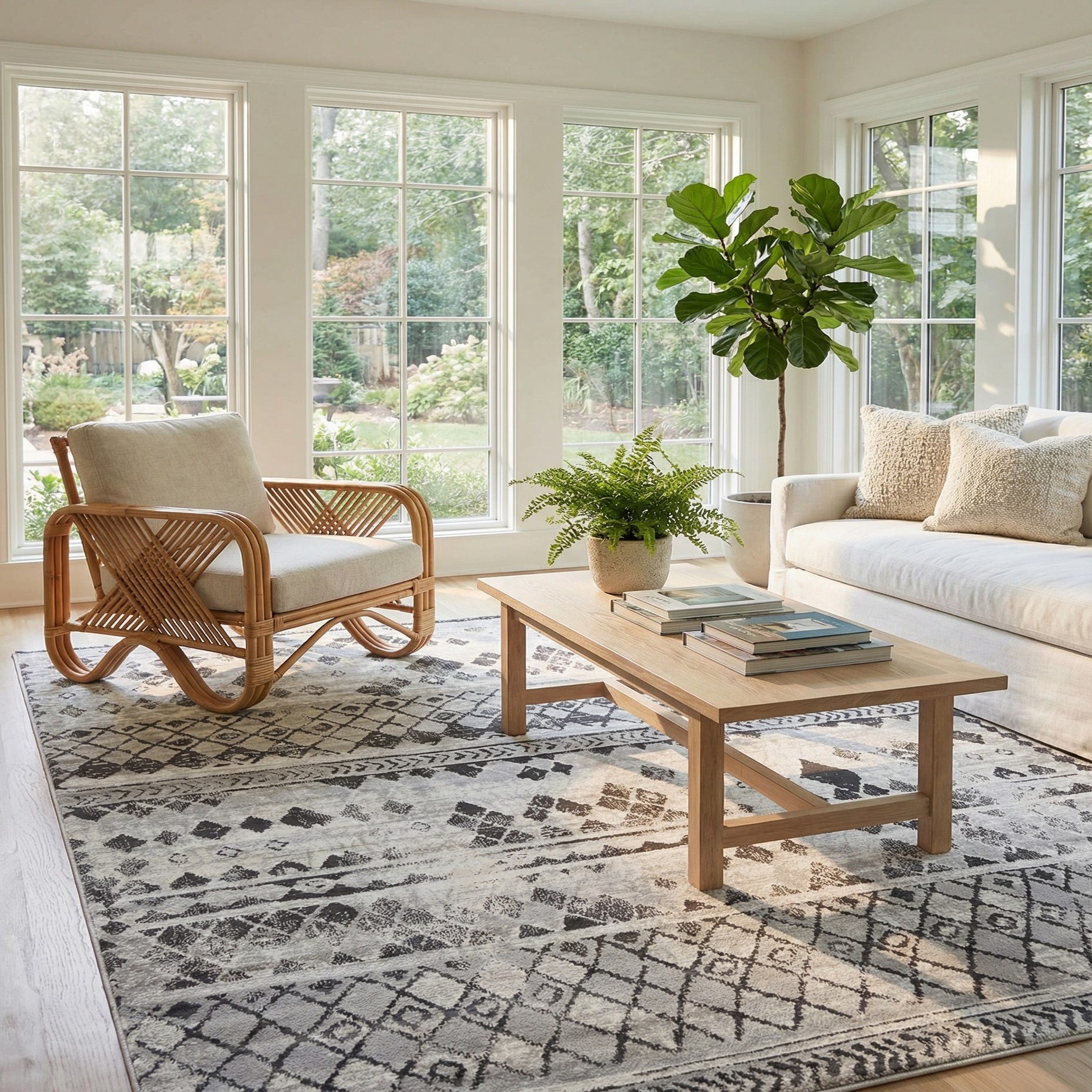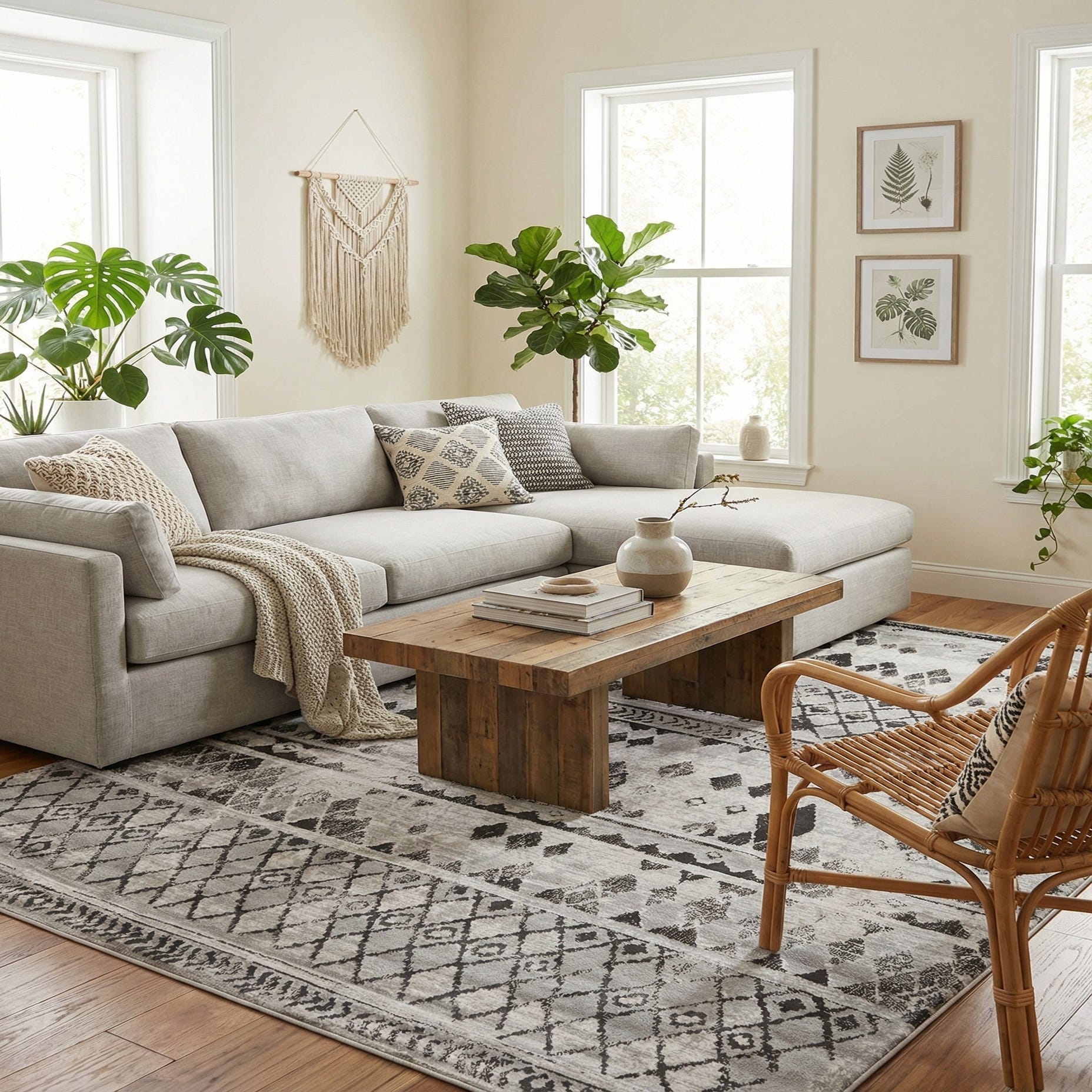 Primary color is Gray. Colors in this rug include: Gray, Ivory.