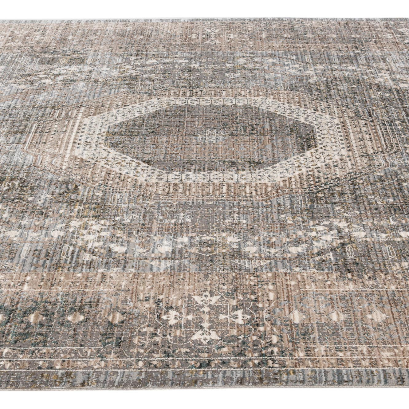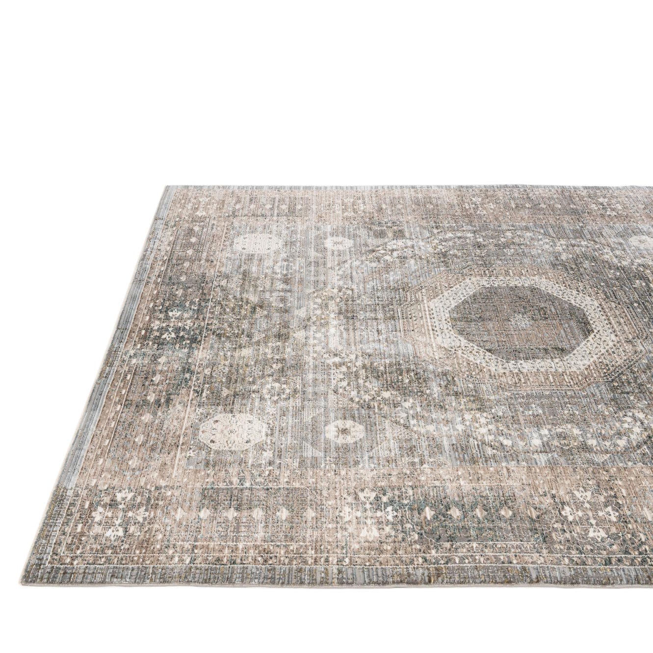 Primary color is Gray. Colors in this rug include: Gray, Brown, Ivory, Olive, Beige.