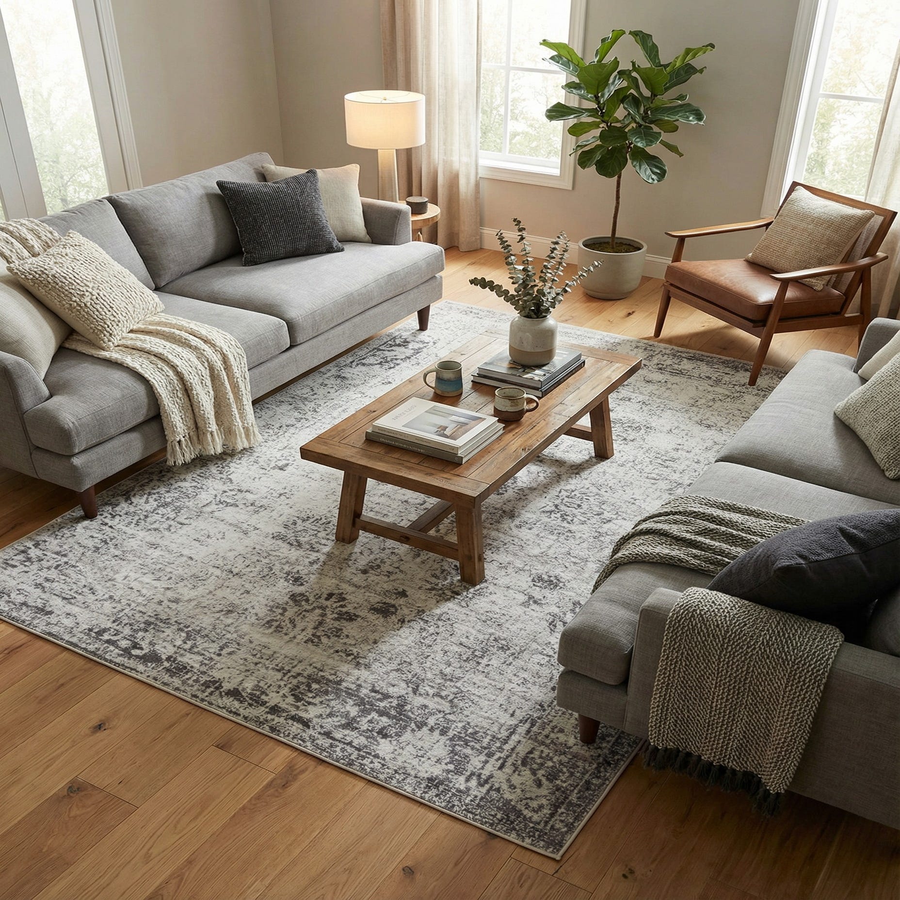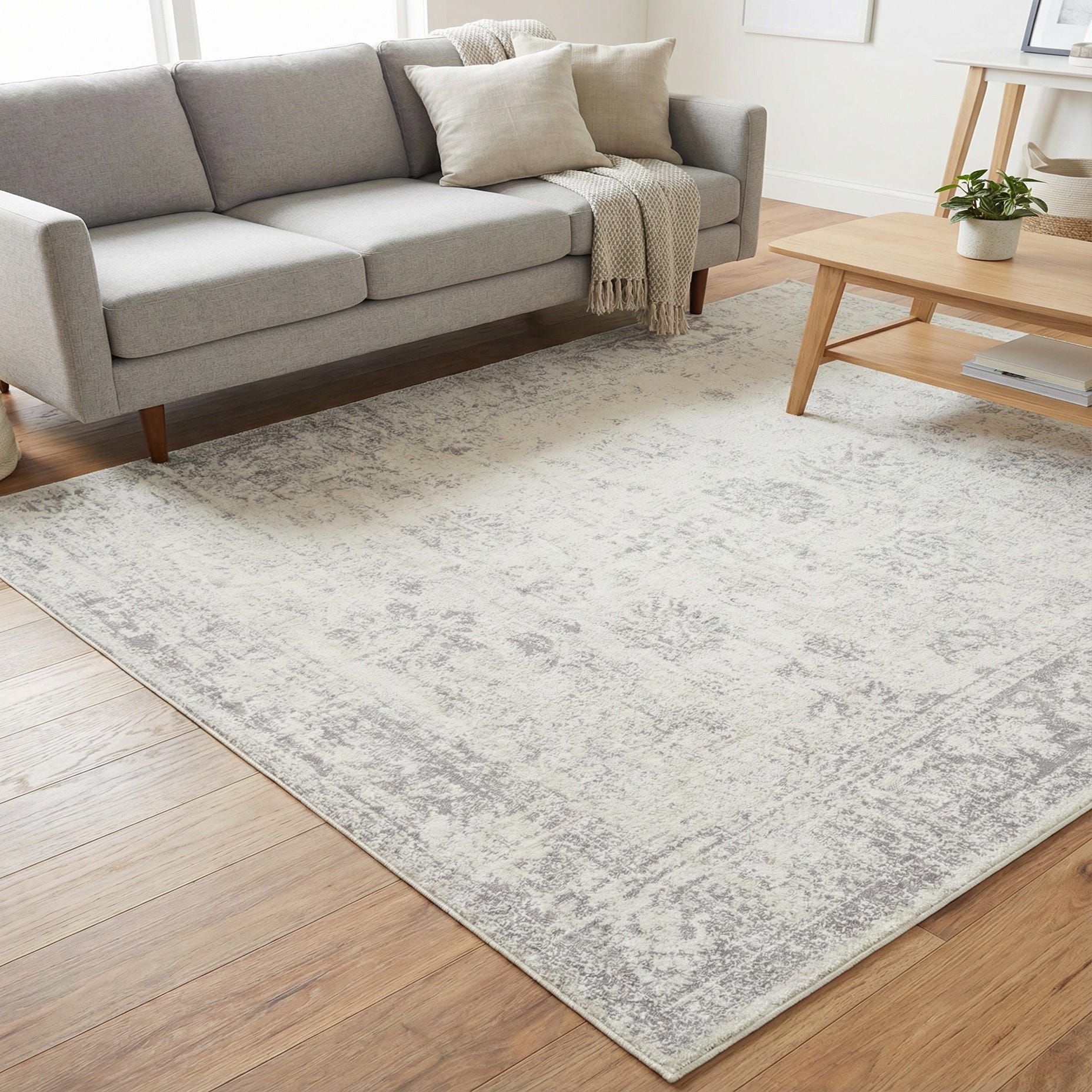 Primary color is Gray. Colors in this rug include: Gray, Beige.