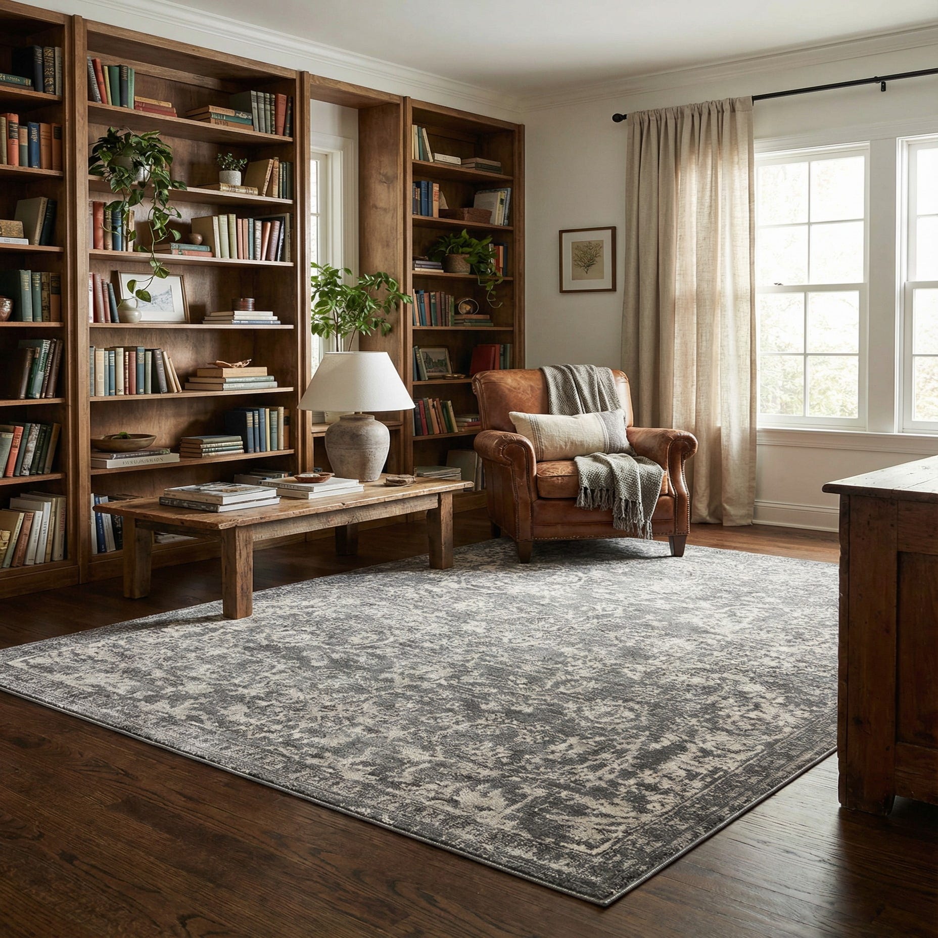Primary color is Gray. Colors in this rug include: Gray, Ivory.
