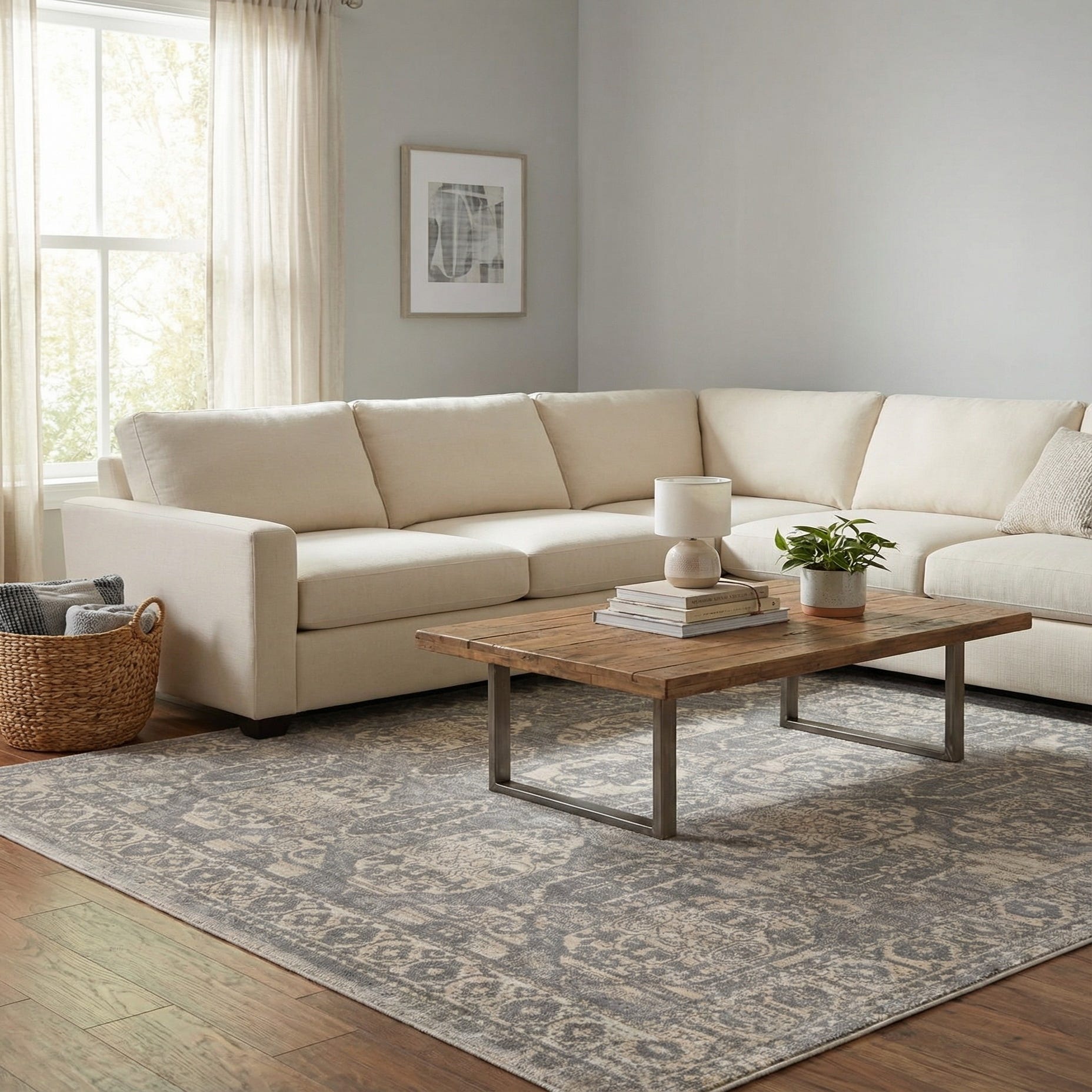 Primary color is Gray. Colors in this rug include: Gray, Ivory.