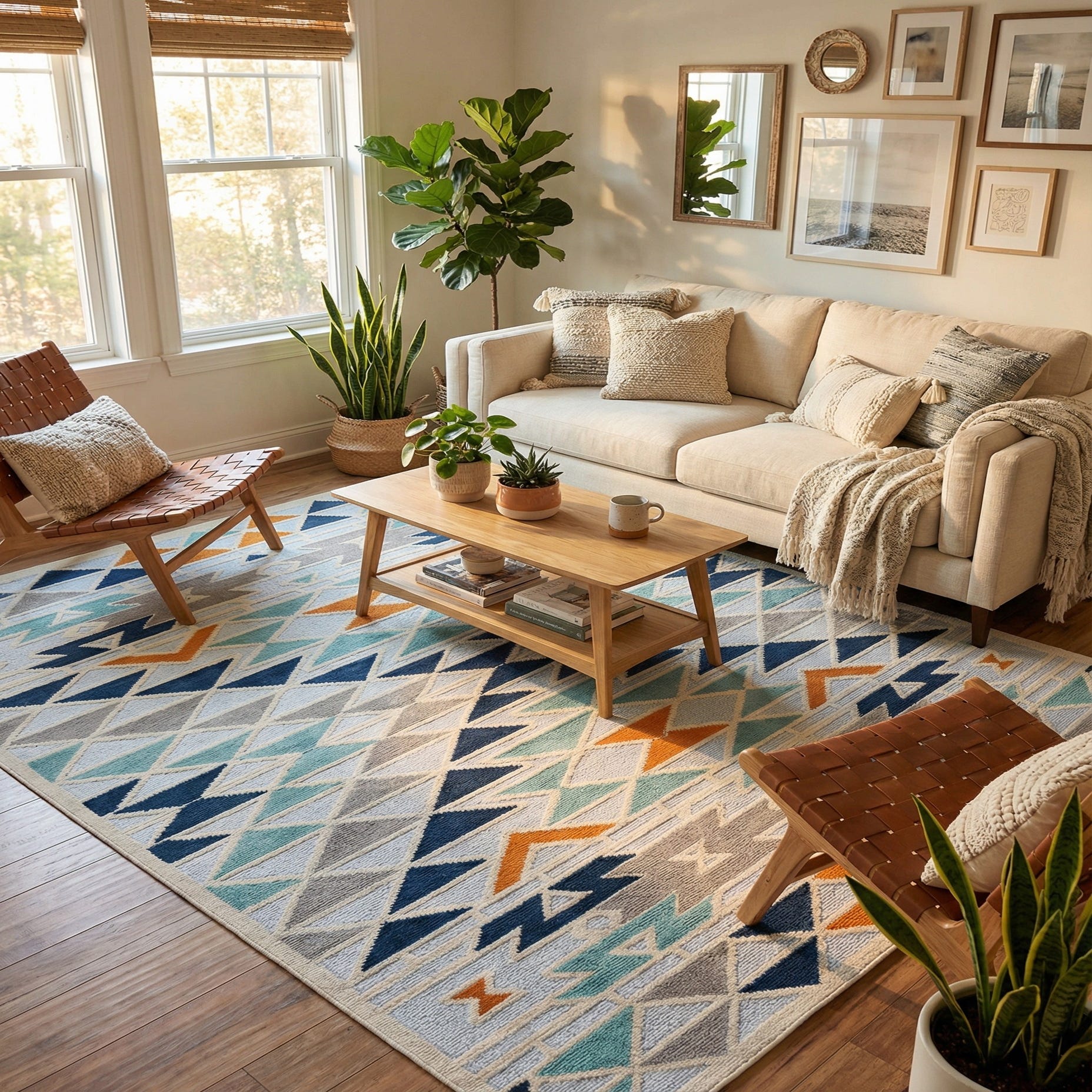 Primary color is Gray. Colors in this rug include: Gray, Ivory, Light Blue, Navy Blue, Orange.