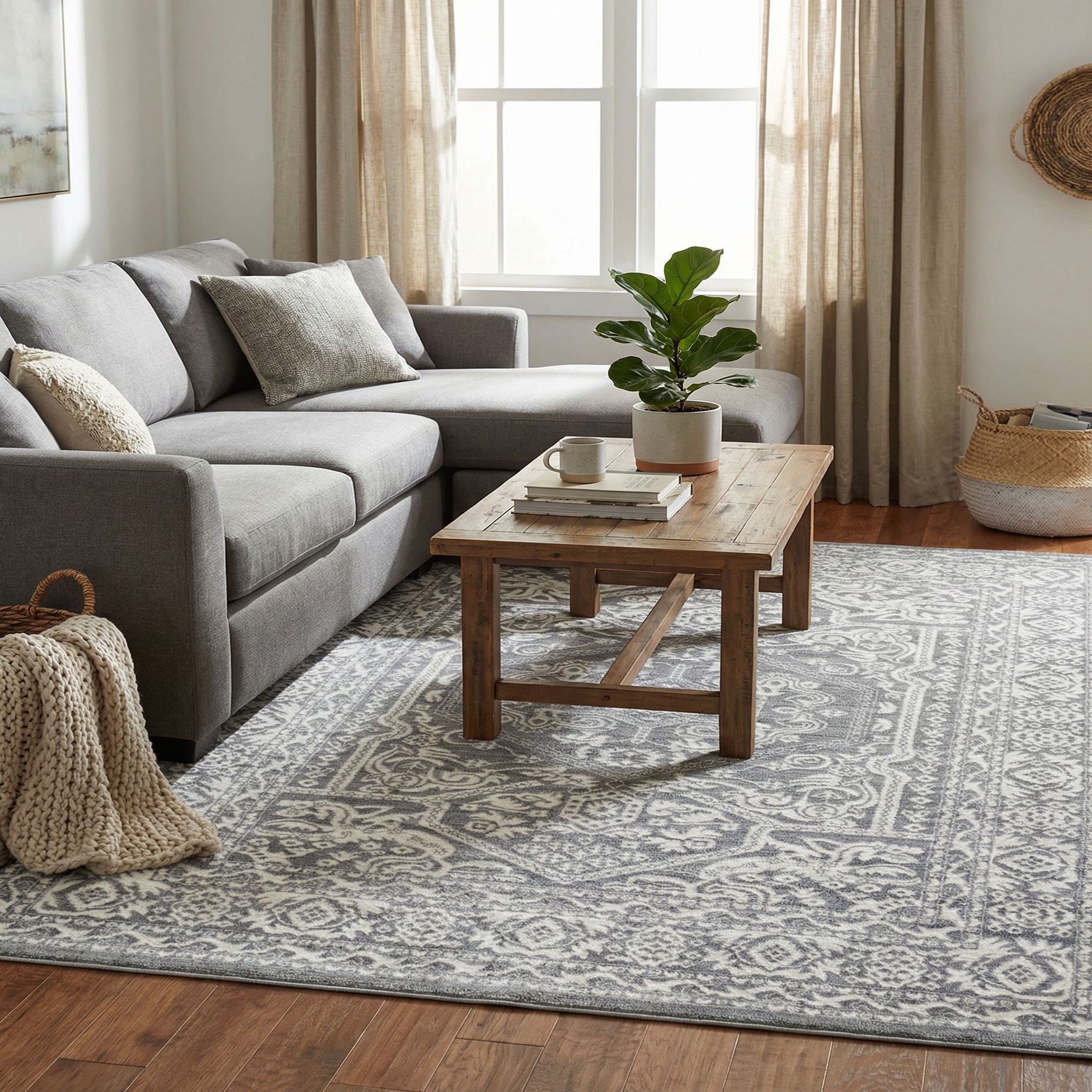 Primary color is Gray. Colors in this rug include: Gray, Ivory.