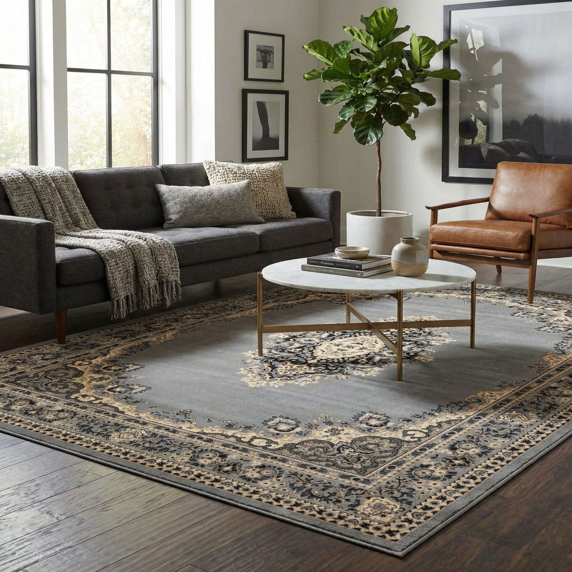 Primary color is Gray. Colors in this rug include: Gray, Black, Cream, Beige.