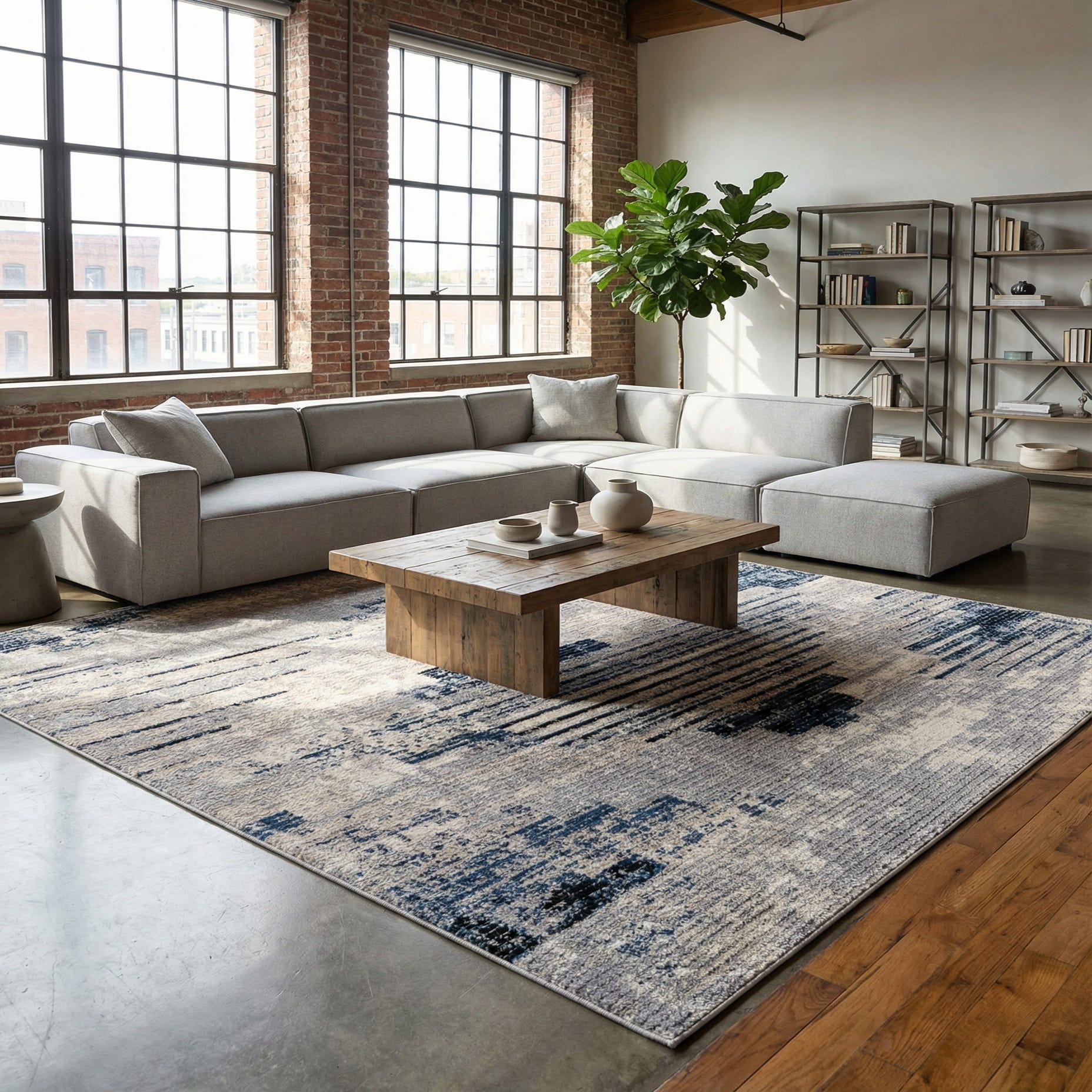 Primary color is Gray. Colors in this rug include: Gray, Beige, Black, Navy Blue.