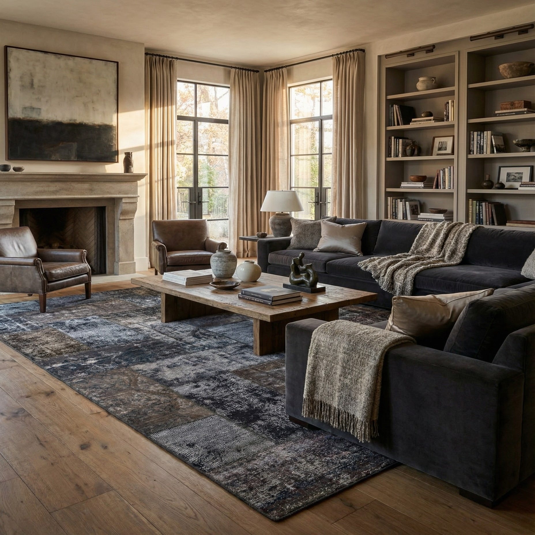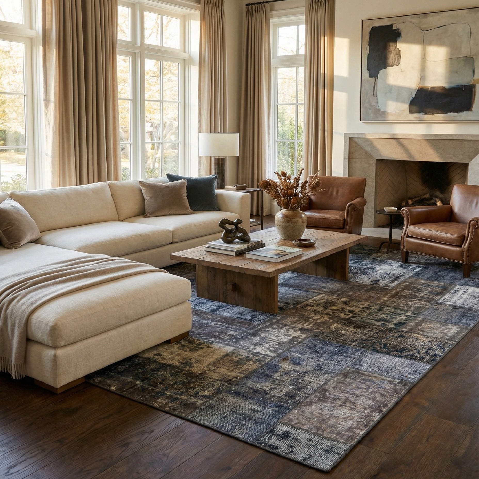 Primary color is Gray. Colors in this rug include: Gray, Brown, Navy Blue, Ivory.
