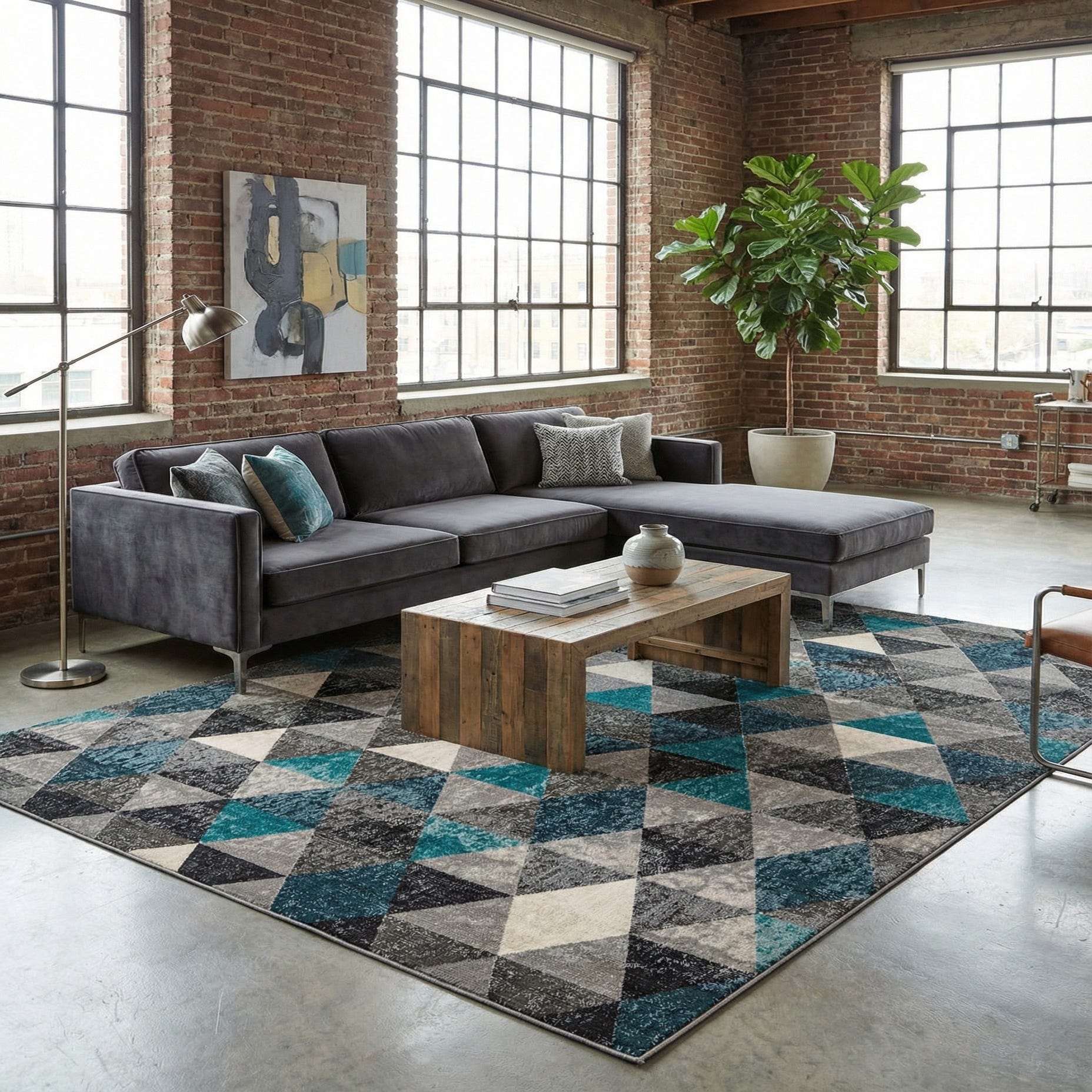 Primary color is Gray. Colors in this rug include: Gray, Black, Blue, Ivory.