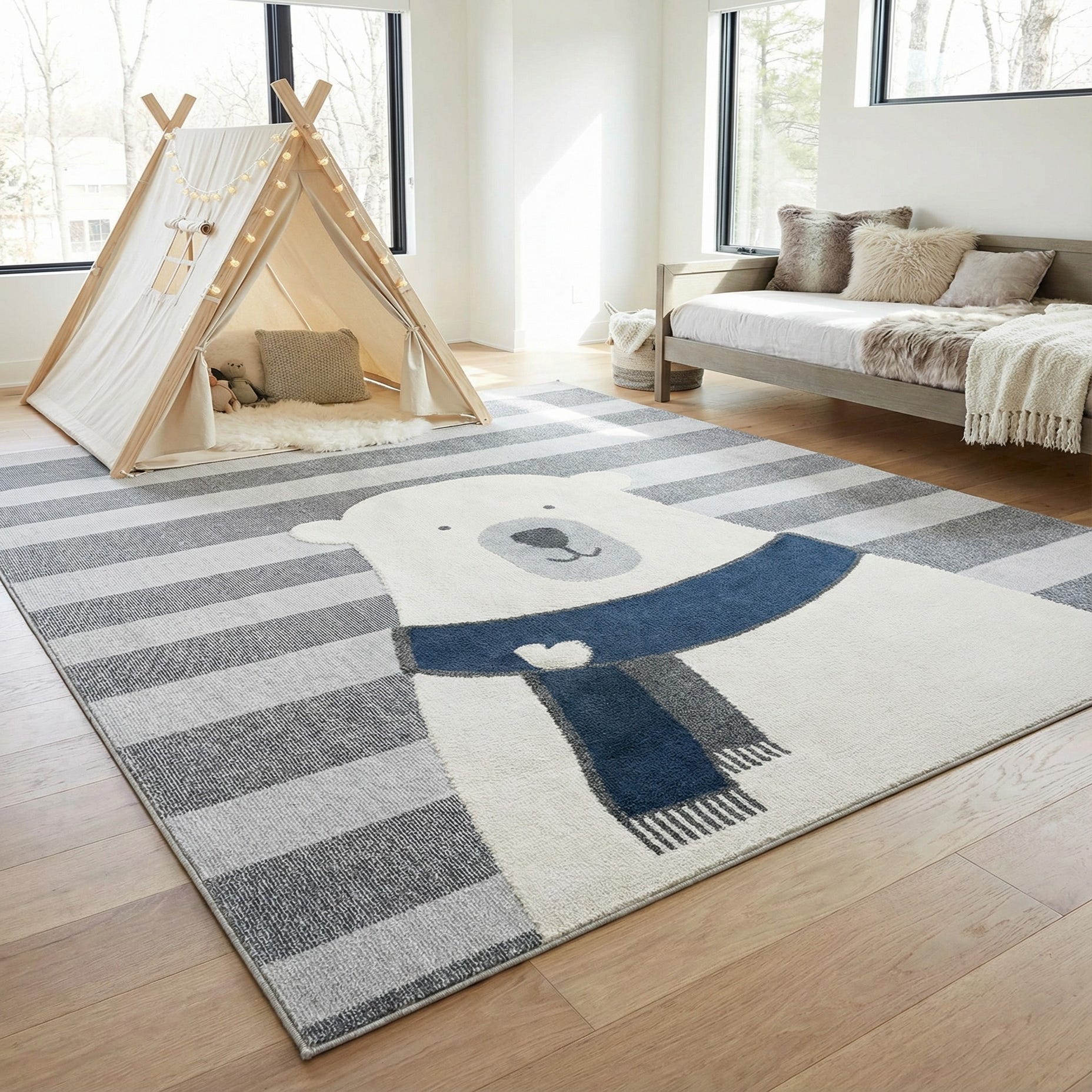Primary color is Gray. Colors in this rug include: Gray, Ivory, Navy Blue.