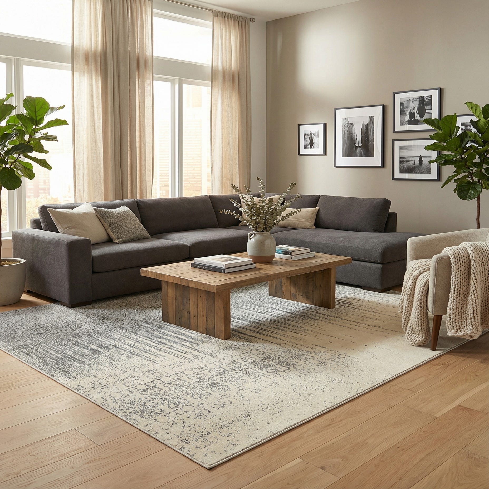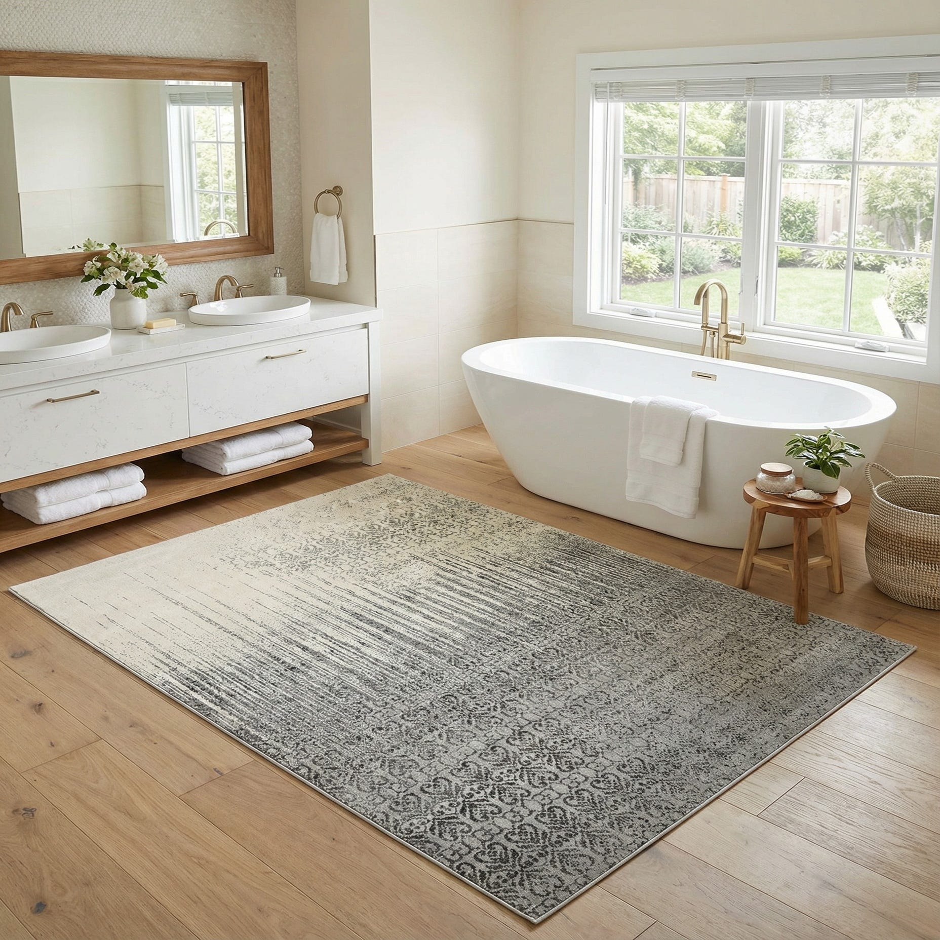Primary color is Gray. Colors in this rug include: Gray, Black, Ivory.