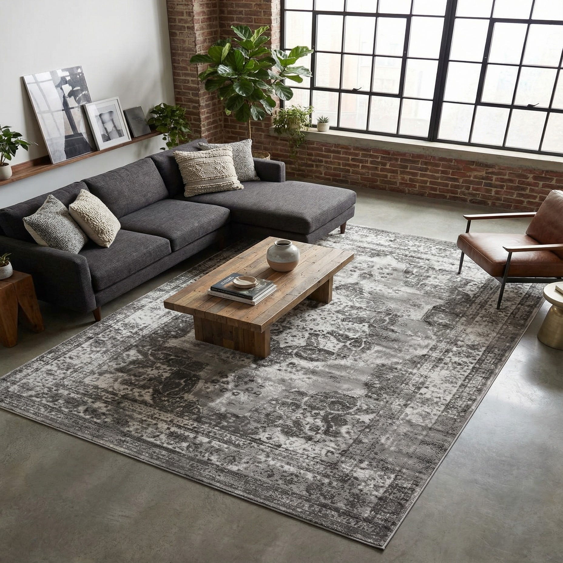 Primary color is Gray. Colors in this rug include: Gray, Beige.