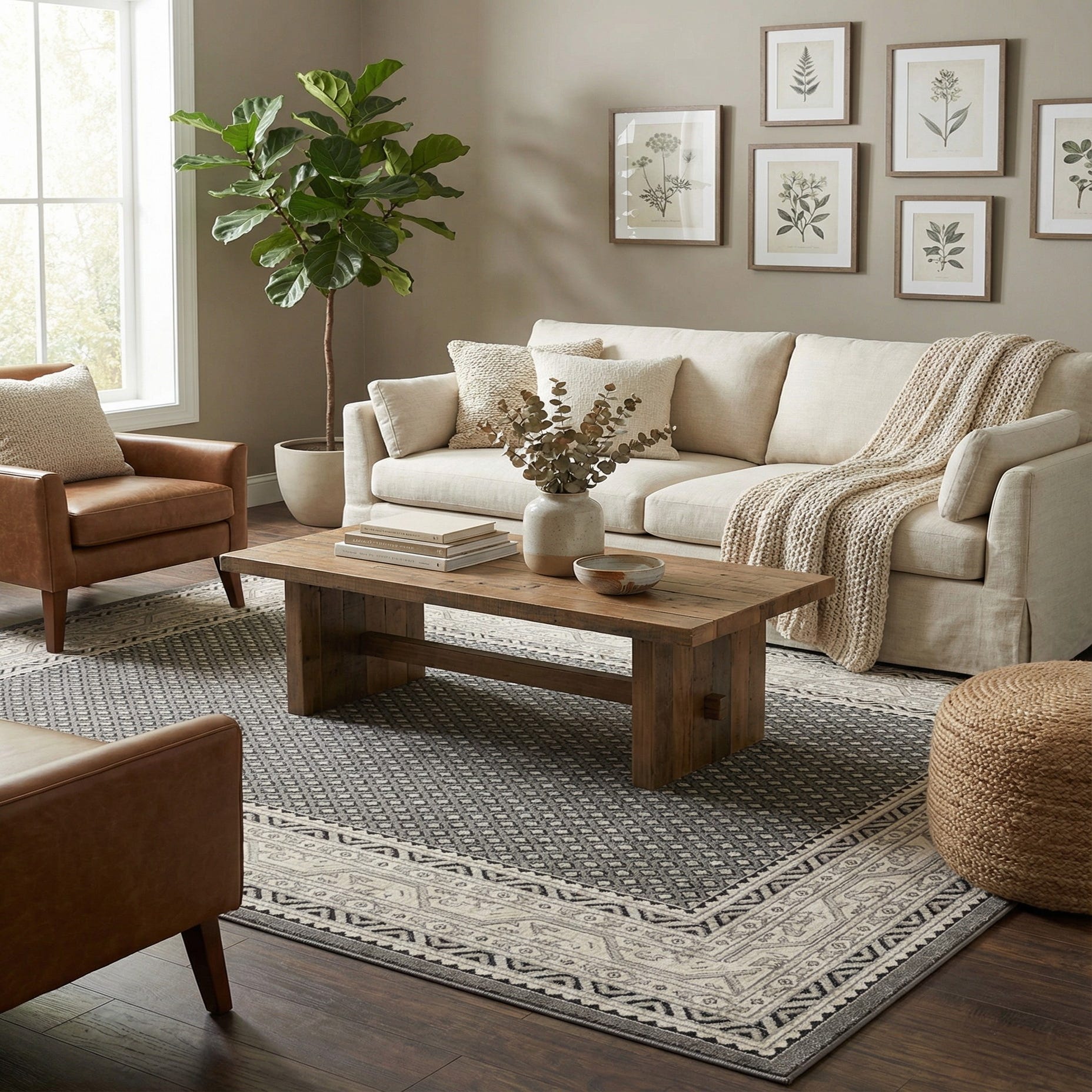 Primary color is Gray. Colors in this rug include: Gray, Beige, Black, Ivory.
