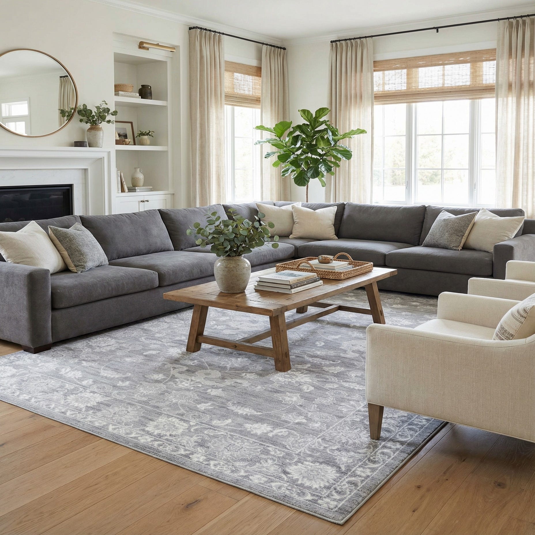 Primary color is Gray. Colors in this rug include: Gray, Ivory.