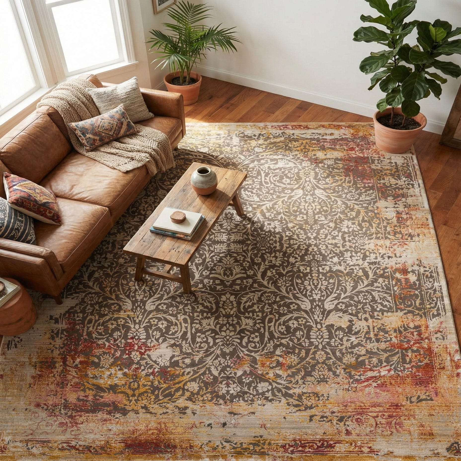 Primary color is Gray. Colors in this rug include: Gray, Burgundy, Gold, Pink.