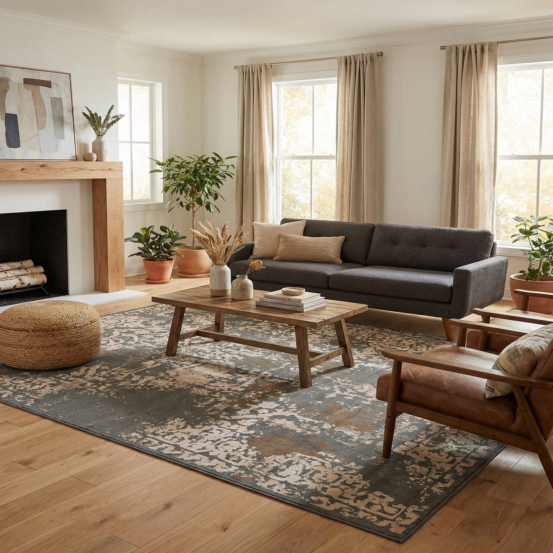 Primary color is Gray. Colors in this rug include: Gray, Beige, Brown, Green.