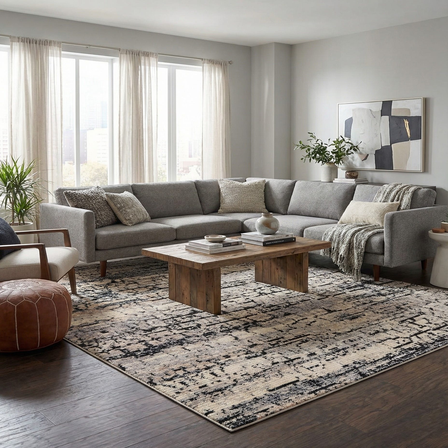 Primary color is Gray. Colors in this rug include: Gray, Beige, Black, Ivory.