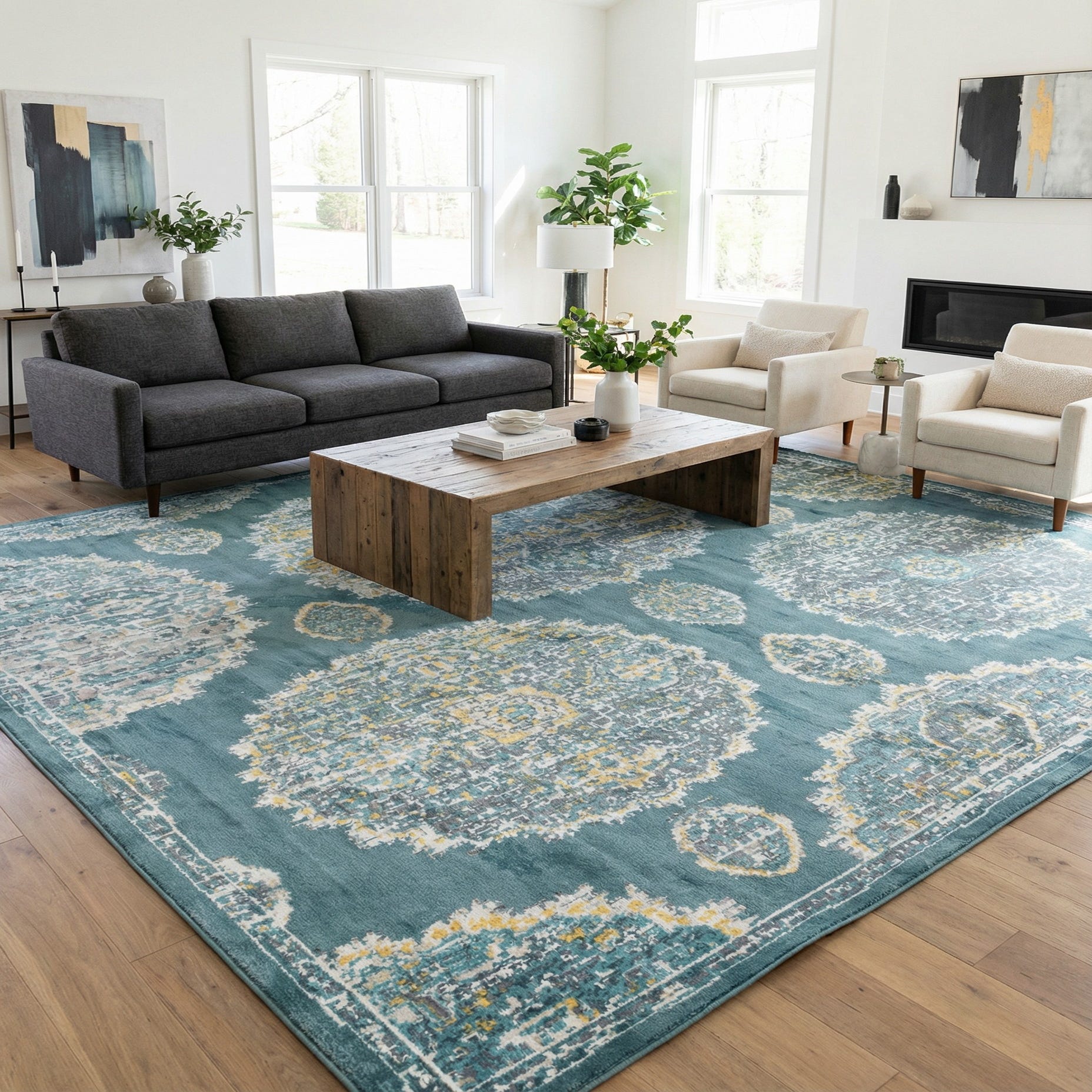Primary color is Gray and Blue. Colors in this rug include: Gray and Blue, Gray, Green, Ivory, Yellow.